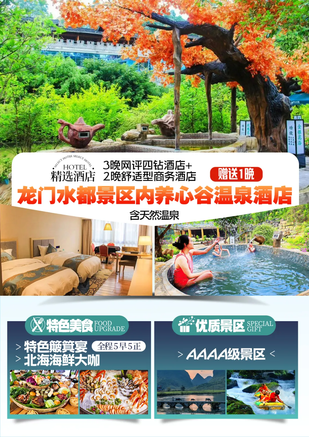 ①【龙门水都文化生态旅游景区】山势蜿蜒,林海苍茫,常年郁郁葱葱,四季仙雾缥缈;盘旋于山间的水流,曲缓流觞,犹如蛟龙出迪。空气清新,安宁静谧,是十分稀有的原生态森林氧吧。秋冬时节,泡温泉正当时,景区天然温泉泉水晶莹剔透,滑爽如抚锦缎,设有10个温泉岛,56个泡池,独具匠心地秘制有53个药浴汤池、当归浴、石板浴、灵芝浴、生姜浴、鲜果浴、牛奶浴、鲜花浴、啤酒浴、咖啡浴等,水中含有20多种对人体有益的微量元素和矿物质。其中鲤鱼湾温泉是纯天然的地下碳酸矿泉水,富含纳、锶、锂、溴、碘、硒、锌等50 多种有益于人体的微量元素和化学成分,对康养理疗十分有益,感受这里不同主题的汤池,不一样的疗效与体验。(请自备泳衣泳裤)