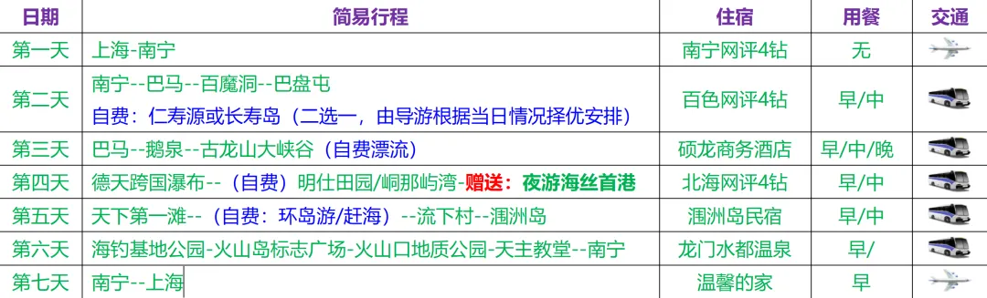 老客专享 长途旅行出行很重要,不担心用车 我们为Vip提供小车上门接送 不用自己操心不用麻烦子女 全程消费透明,无套路 接送服务为老客户福利 从开始到结束,服务始终相伴 ![]() 杭州、宁波、温州、无锡、南京、苏州、合肥等 安徽、江苏、浙江、江西。。。全国均可出发 专注广西17年,给你更多更好! |
