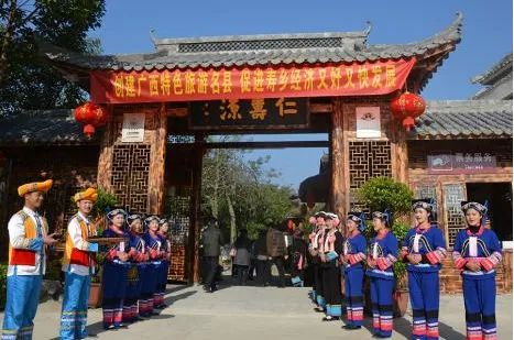 【仁寿源】:是巴马长寿文化发源地、当地唯一人文景区,为清光绪年间获赠“惟仁者寿” 寿匾的邓诚才老人故居。景区占地 50 亩,融合长寿、养生、孝道、饮食文化,配套休闲设施,是体验巴马长寿奥秘、感受长寿文化的核心平台。景区位于巴马那桃乡平林村敢烟屯,背靠赐福湖,距县城 10 公里,车程约 15 分钟;“敢烟” 为壮语,意为山洞飘烟,增添神秘色彩。可体验:了解长寿文化与老人生活、制作糯米饼等长寿小吃、品尝瑶族长桌宴,参与篝火晚会,观赏上刀山、下火海、瑶族舞蹈等特色民俗表演。