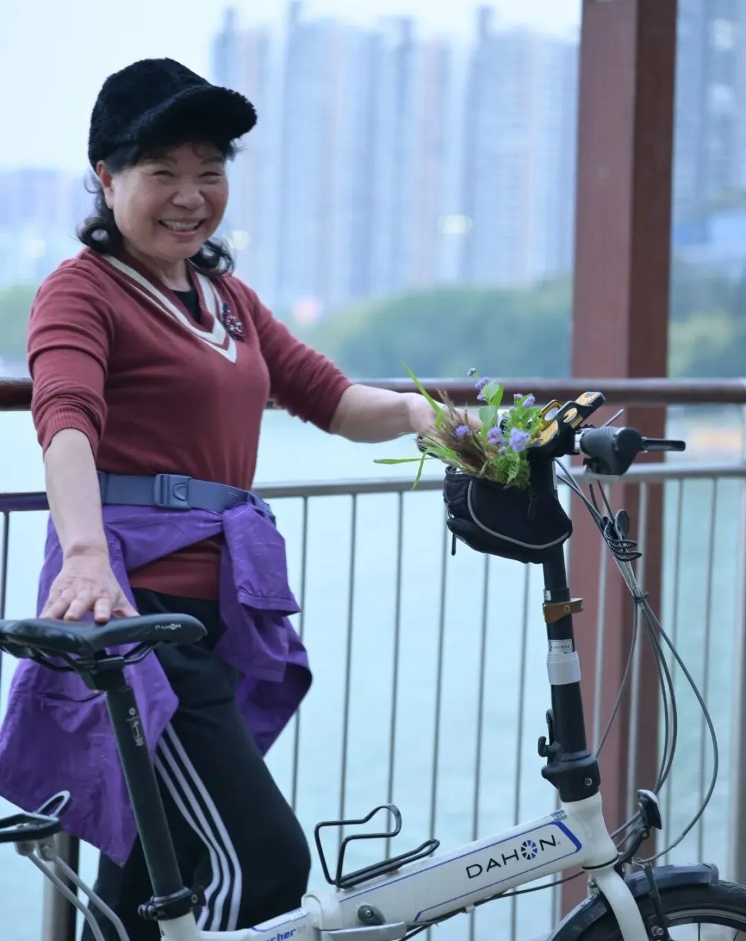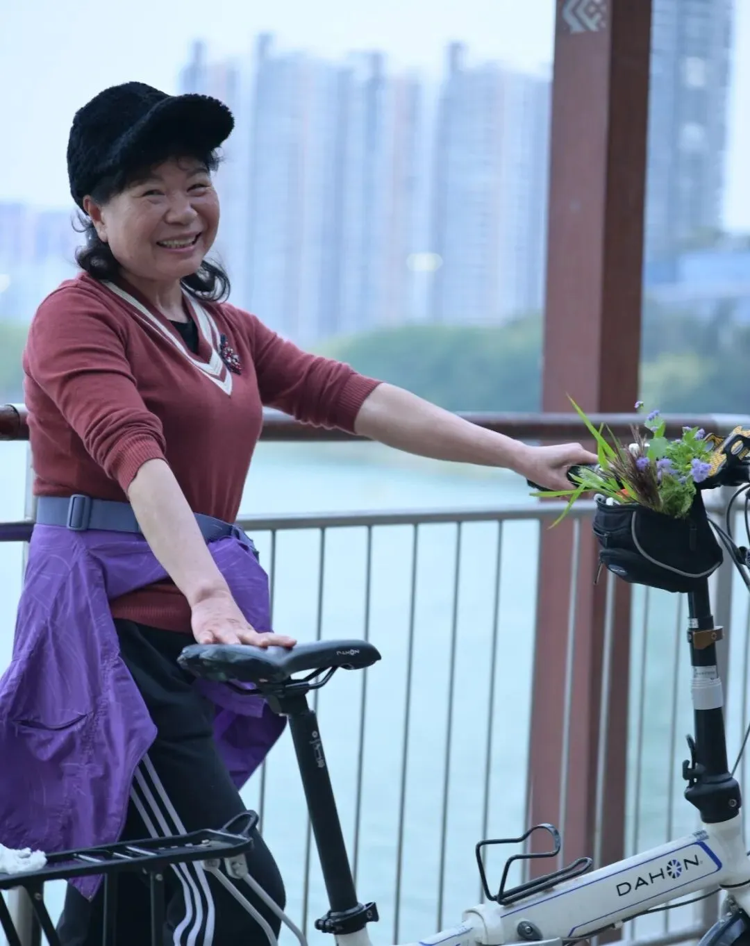 我实在太喜欢这位阿姨了,忍不住举起相机为她拍了几张。阿姨看到照片特别高兴,非常配合地摆动作,笑着说:“今天也来臭美一下!”真是可爱极了……