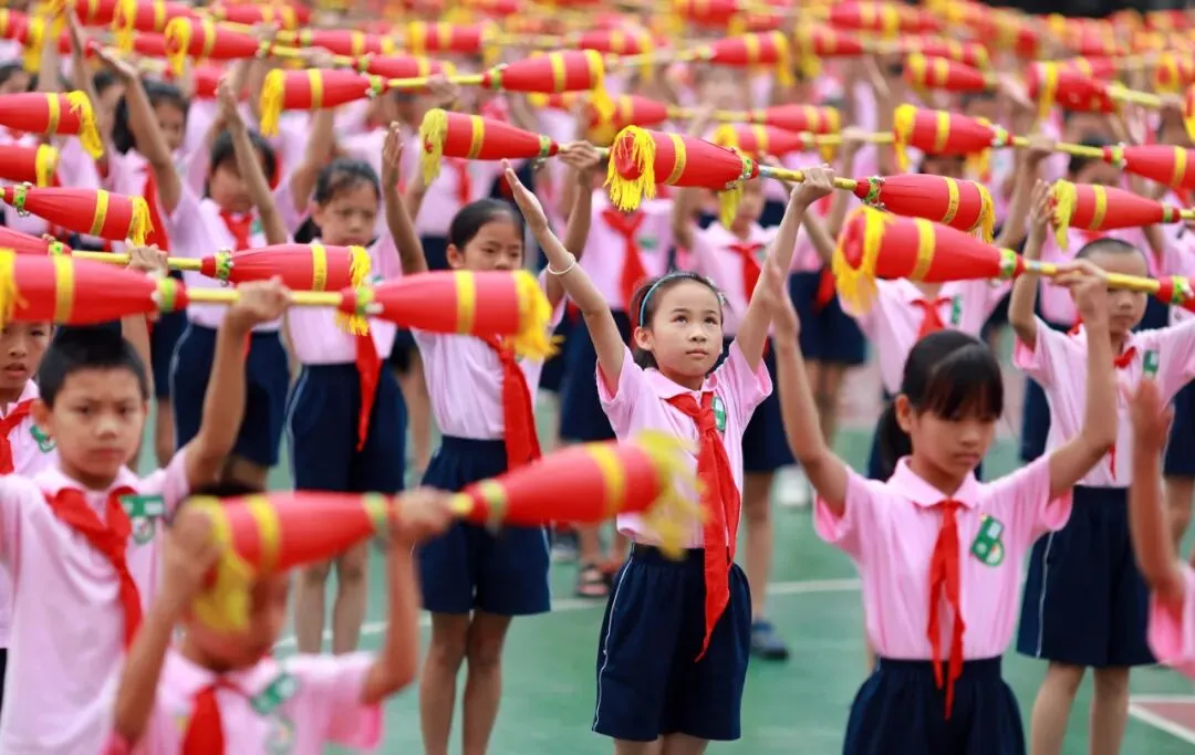 6月24日,在恭城瑶族自治县第一中心小学,1000多名学生在大课间上跳起欢快的“长鼓舞”。刘教清/摄