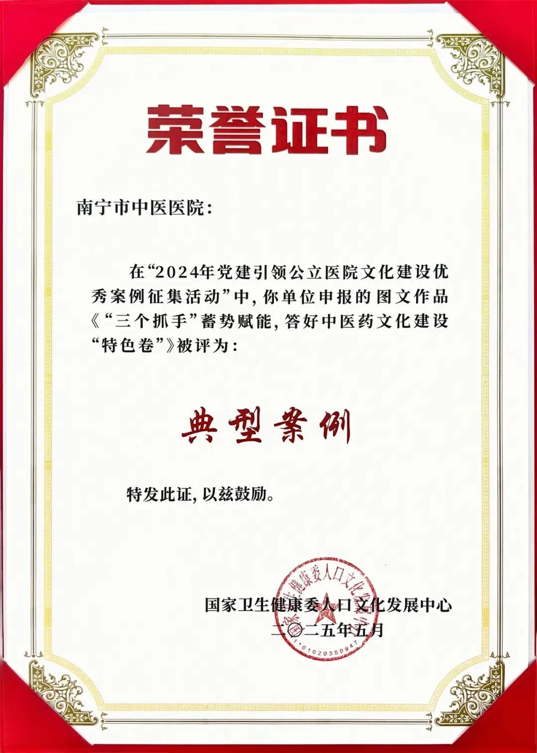 在浙江台州举办的"2024-2025党建引领公立医院文化建设经验交流活动"上,南宁市中医医院申报的《"三个抓手"蓄势赋能,答好中医药文化建设"特色卷"》获评全国典型案例。医院通过阵地建设、对外传播和产业融合三大举措,打造中医药文化品牌,开展科普活动200余场,研发179种特色制剂,并推动中医药海外传播。未来,医院将继续探索党建引领中医药文化发展新模式。