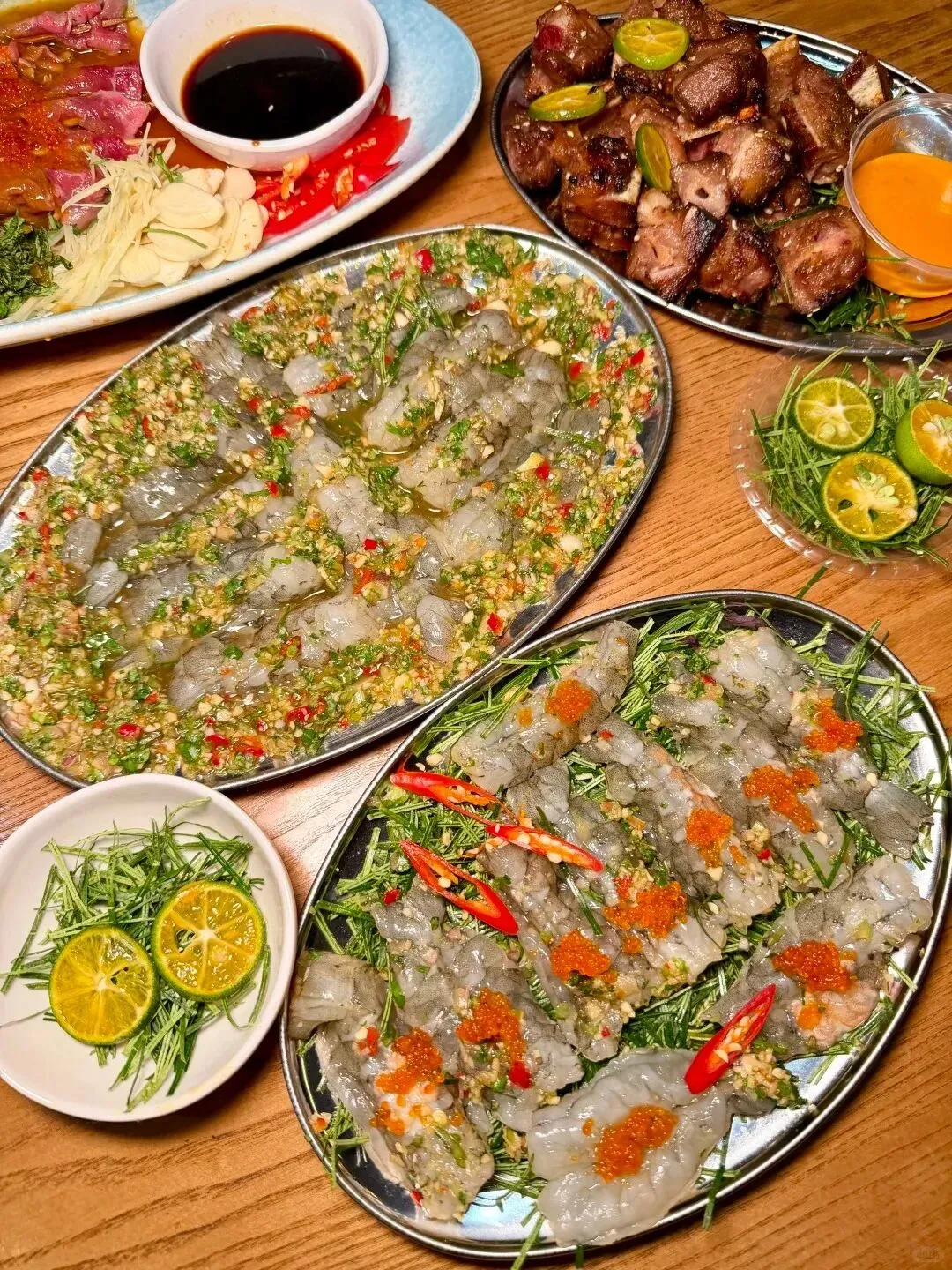 店里新出的虾生更是给足了惊喜,晶莹剔透的虾肉铺满了各种灵魂香料,蘸着特调的酱汁吃一口,鲜甜软糯又爽口,真的是一点腥味都没有。