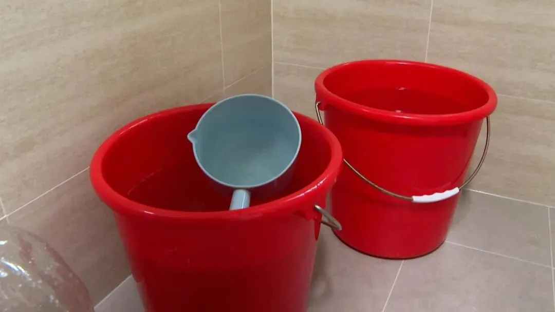 现在这边洗澡还能洗吗?肯定洗不了了。你看现在这个水是停水之前通知我们提前接好水的,我们接完两桶水,现在我想接一点水,现在已经接不下了,这两桶用完了,也我们也不知道怎么办了。