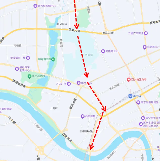 在南北快速路最早的规划方案中,这条全长约21.2公里的快速路,北起北绕城高速公路西津立交,沿高新东三路、农院路,直接穿越广西大学,然后一路向南,经北大路、永和路跨邕江,最终抵达那洪收费站。