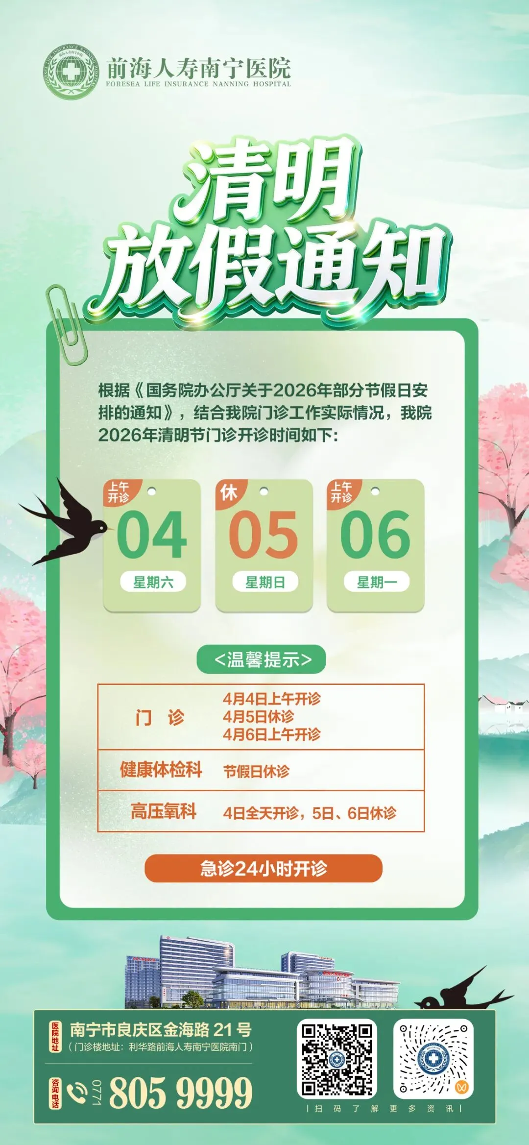 重要通知 | 前海人寿南宁医院2026年清明节假期门急诊安排