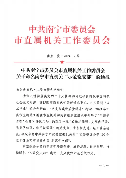 近日,中共南宁市委员会市直属机关工作委员会印发《中共南宁市委员会市直属机关工作委员会关于命名南宁市直机关“示范党支部”的通报》。