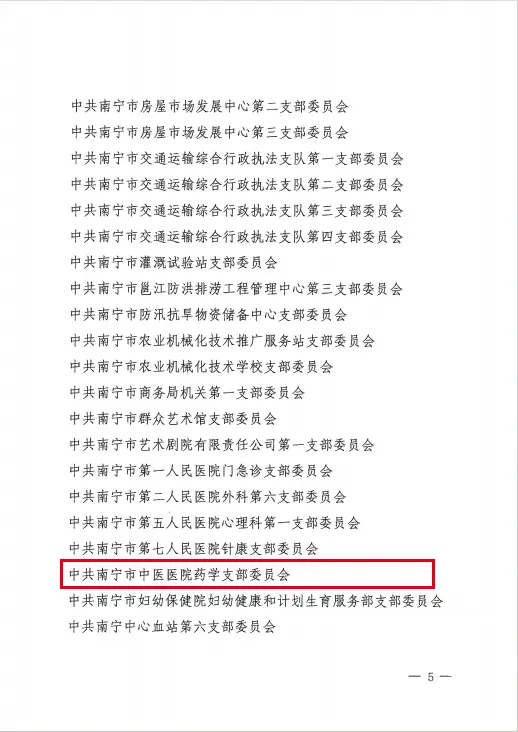 南宁市中医医院药学党支部荣获南宁市直机关“示范党支部”。这是我院药学党支部继获评南宁市卫健系统“百强党支部”的又一佳绩。