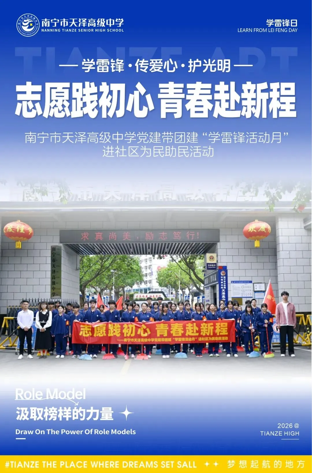 志愿始于心,奉献在于行。南宁市天泽高级中学此次学雷锋志愿活动,让师生们在实践中感悟雷锋精神的时代内涵,在服务中传递温暖、凝聚力量。下一步,学校将继续以党建带团建,把雷锋精神融入日常、化作经常,开展更多形式多样的志愿活动,引导广大青年学子将奉献精神内化于心、外化于行,用青春力量书写新时代的雷锋故事,让志愿之花在天泽校园与社区大地持续绽放!