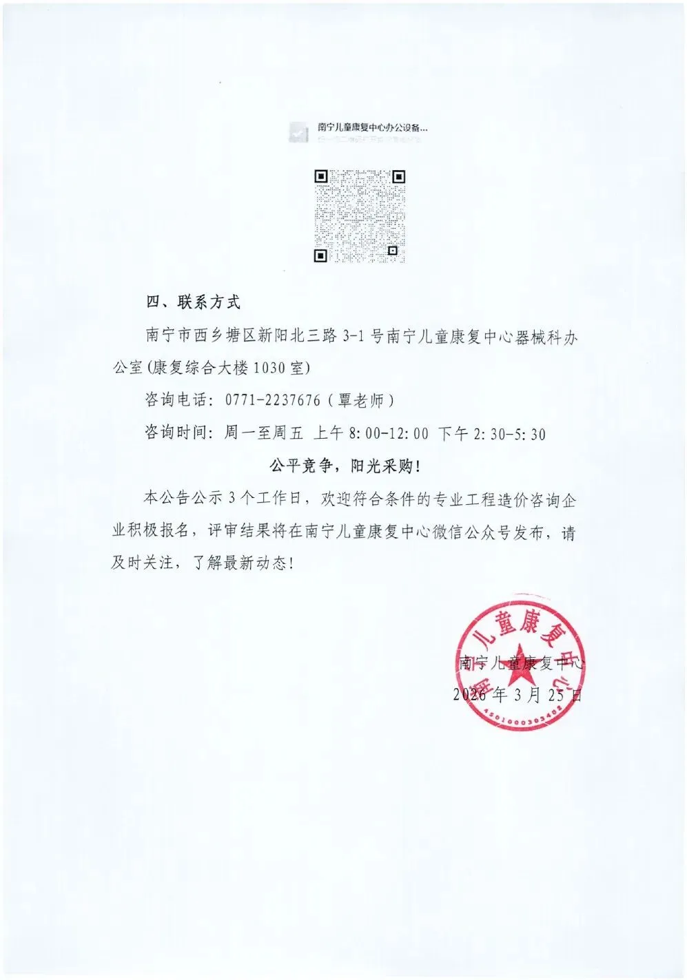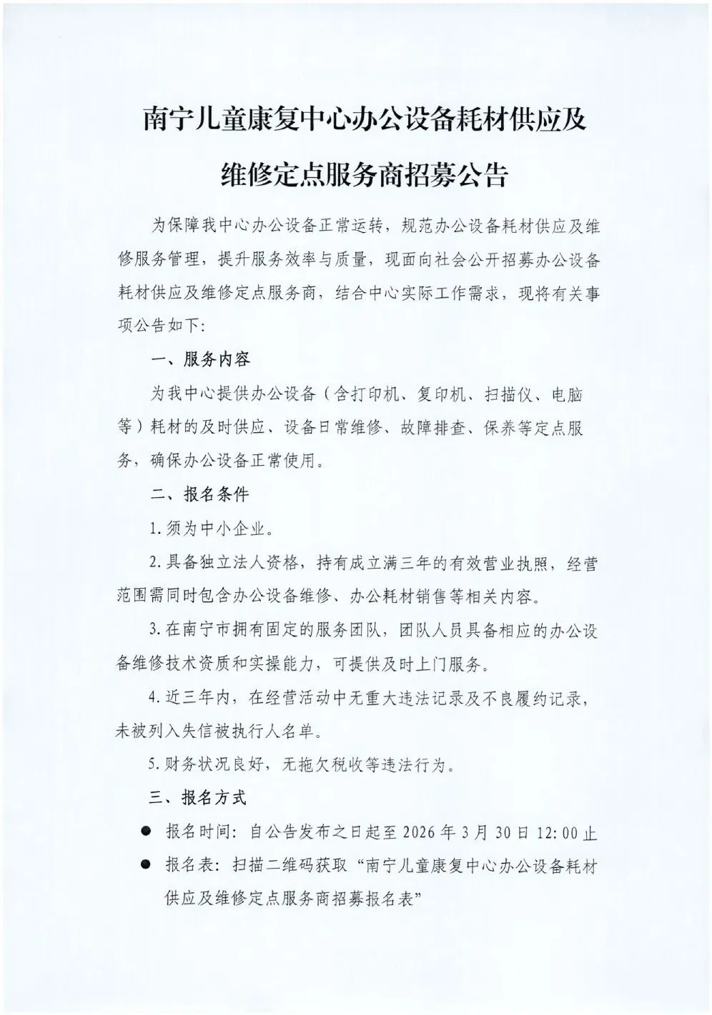 南宁儿童康复中心办公设备耗材供应及维修定点服务商招募公告