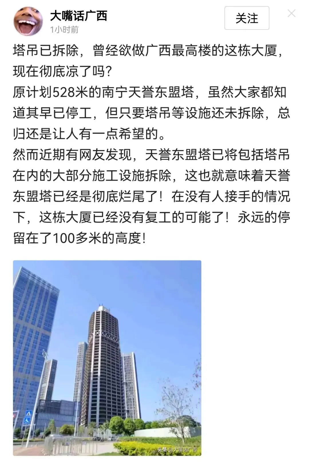 关于南宁东盟塔(通常指南宁天誉东盟塔),截至2026年3月的综合信息显示,该项目因政策与资金双重困境,长期处于停工(烂尾)状态,复工前景不明。