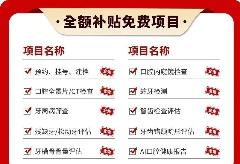 在定点医疗单位,全额减免看牙预约、挂号、建档、口腔检查、种植牙/牙齿矫正拍片、AI口腔健康报告等10项费用。
