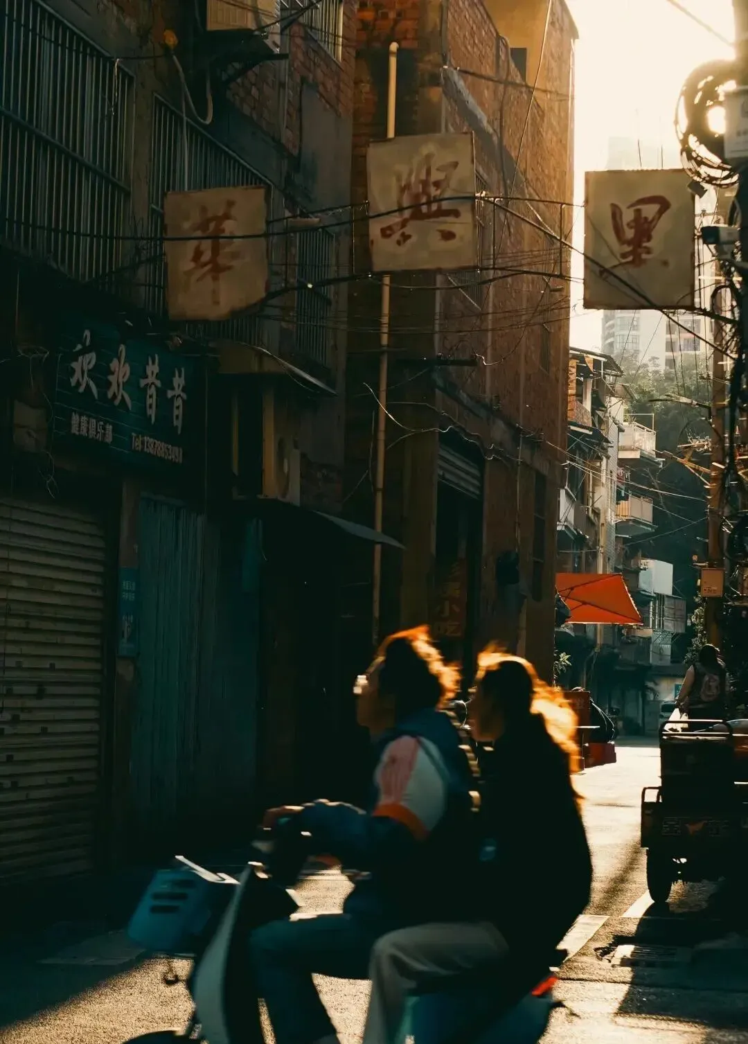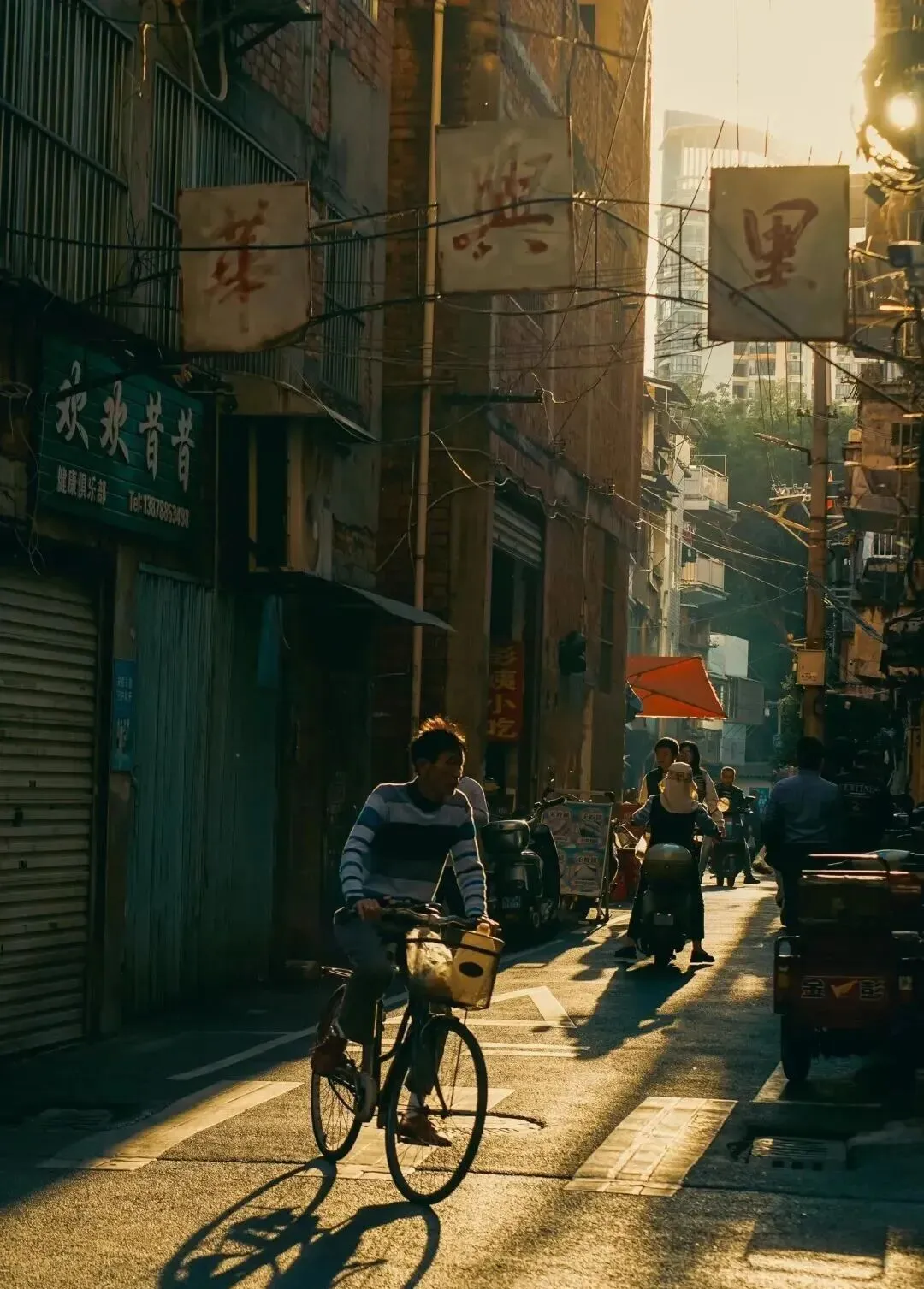 图里这条巷子一眼就能认出来,路面不宽,红砖墙贴着蓝黑色的老影子,太阳从拐角那头斜过来,照得电线都发亮。你看街上骑车的人,衣服颜色一晃一晃的,车轮压过水泥地那一下,声音不大,偏偏就很清楚。爸那会儿常推着车走得稳,妈跟在后面指着路说,看到那块旧招牌就拐,别走错。现在再看,招牌还在,灯光和人换了,巷子却还是那口气在。