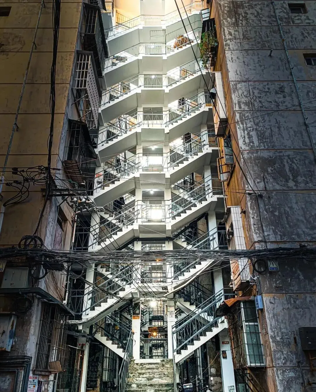这个地方像住在半层楼上的记忆,楼梯拐来拐去,钢筋栏杆细细密密,白色台阶被光照得发亮,墙面却是老旧的灰。图里看着就很有“走动感”,上去要贴边儿,下来要踩稳,脚步声会在楼道里回一下。小时候我问妈这楼为什么弄成这样,妈说过,老房子当年就那样凑出来的,住的人多,路越窄越得讲规矩。那时候大家出门都带着“碰不着就让一下”的习惯,挤在楼道里也不急不吵。