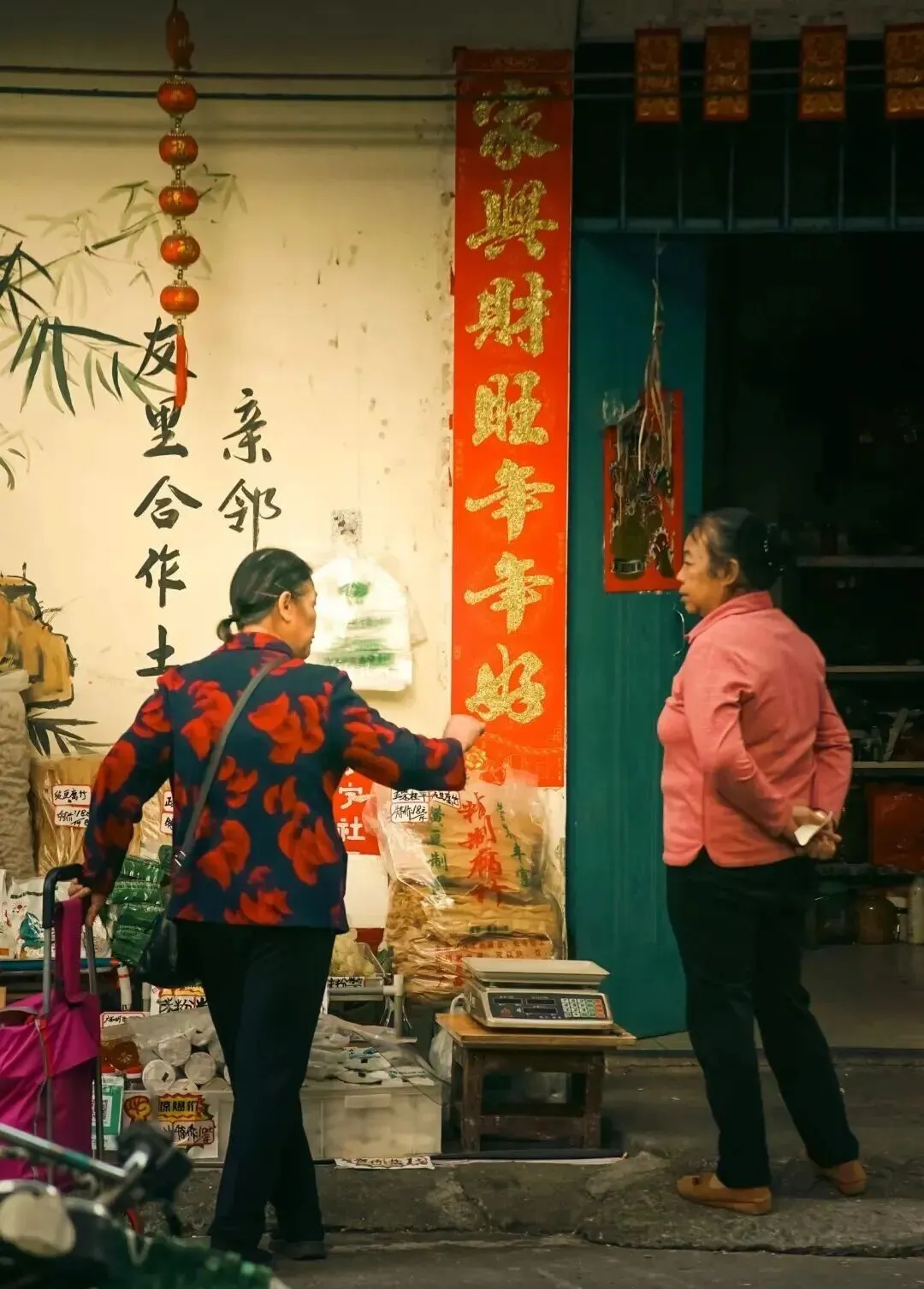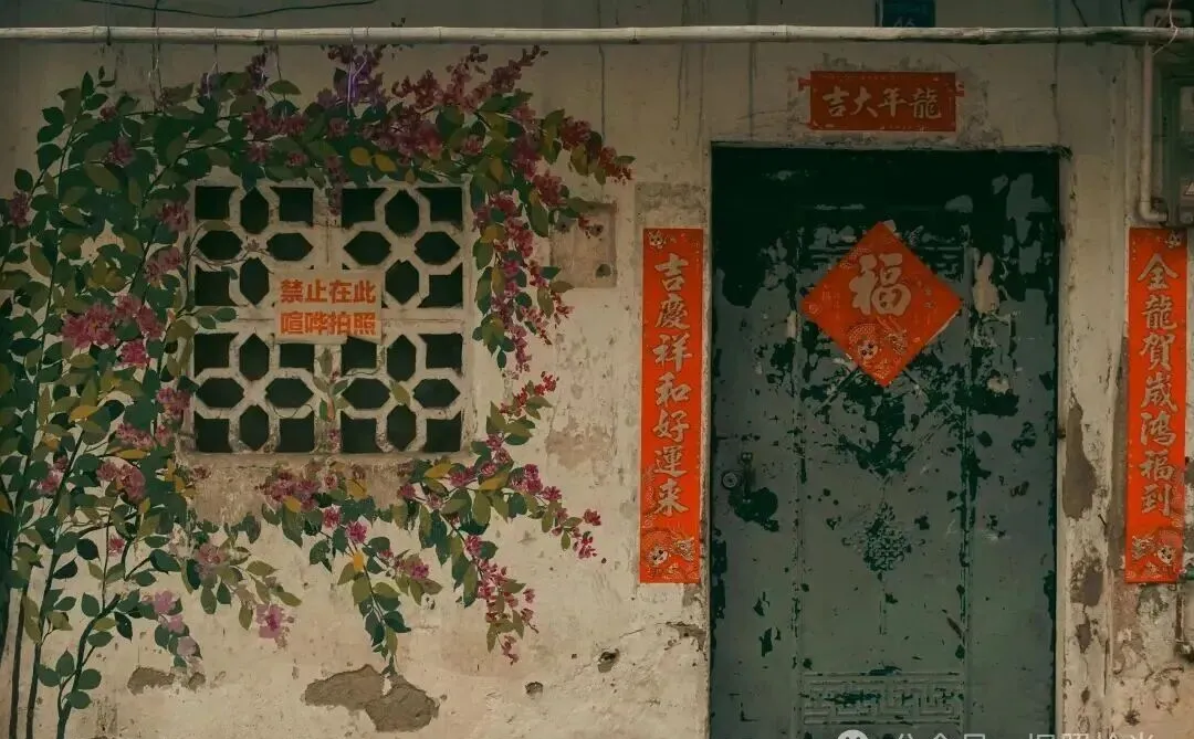 图中最直观的是门口的老气味,墙面褪色又斑驳,墨绿色的门板带着旧划痕,旁边贴的福字还留着红光。风一吹,花纸上那些纹路就像要活过来。妈说以前过年最忙的不是买东西,是贴对联,贴歪了要重来,贴得端端正正才算年味。你看那排门边的装饰位置很讲究,都是大人踮着脚找的高度,孩子站旁边拿着纸角当“助手”。现在再看,福字还是那个福字,可新房的墙面光滑了很多,贴上去少了那种被时间揉过的厚度。