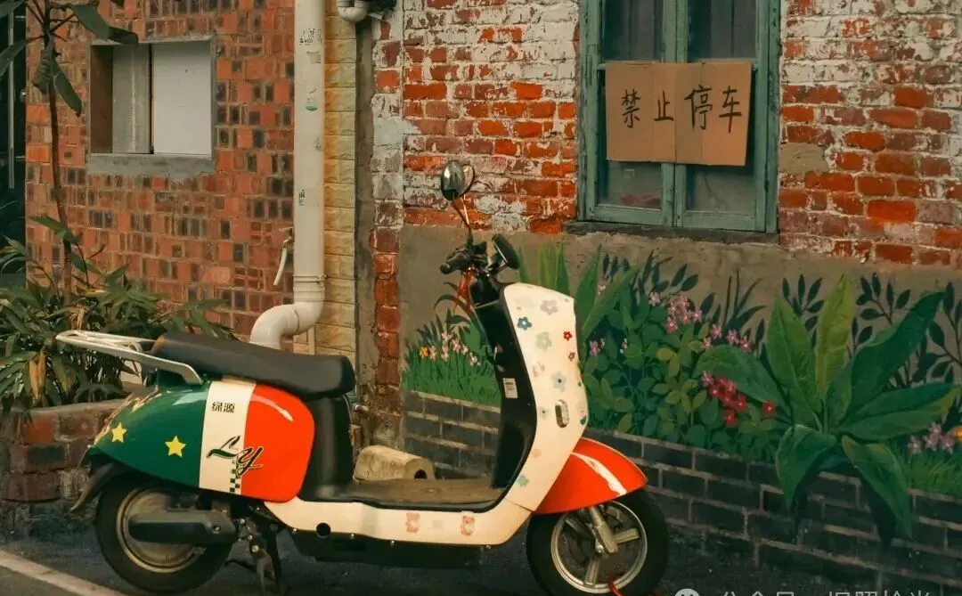 图里这辆小电动车停在院边,车身配色很鲜,红白绿的线条像给红砖屋打了补丁。车前的小镜子亮着,旁边还能看到破旧的砖墙和窗格,墙上挂着旧牌子,连“禁止停车”都像被岁月磨出字边。爸年轻时出门很讲顺路,骑得不快,手却稳,因为巷子里沟沟坎坎多。妈说有一次她抱着菜篮子从门口出来,车子刚停稳,后头就有人喊她小心点,她就笑着回一句“我知道”。那一声笑到现在都还在,笑不是为了热闹,是为了日子能平平稳稳。