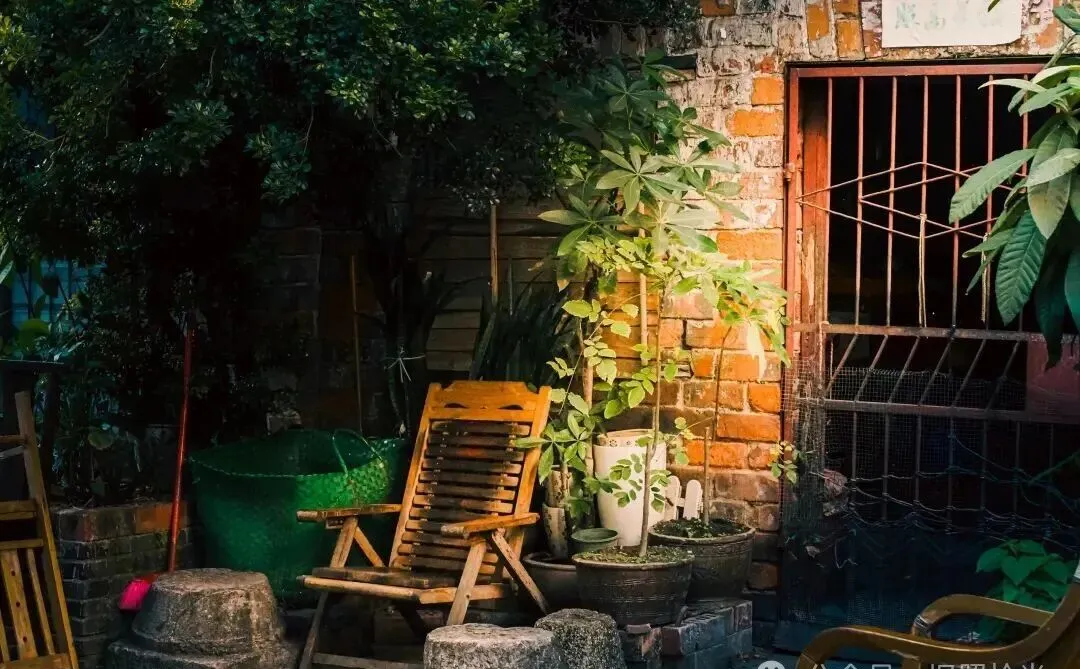 这张图是巷子最温柔的角落,红砖墙后面种着绿,院里摆着木椅,几口花盆排着队,像谁都舍不得让角落空着。你看那把椅子,木条被用得发亮,边角有些磕碰,却反而显得耐看。小时候我坐不稳椅子会抖,奶奶就拿着小茶壶出来,嘴上说别乱动,手却把椅子扶正。院子里的人不多,但每天都有人路过,浇水的水声很轻,叶子滴下去也不响,可就是能把心定住。现在院子还在,只是忙的人少了点,风吹过也更慢。