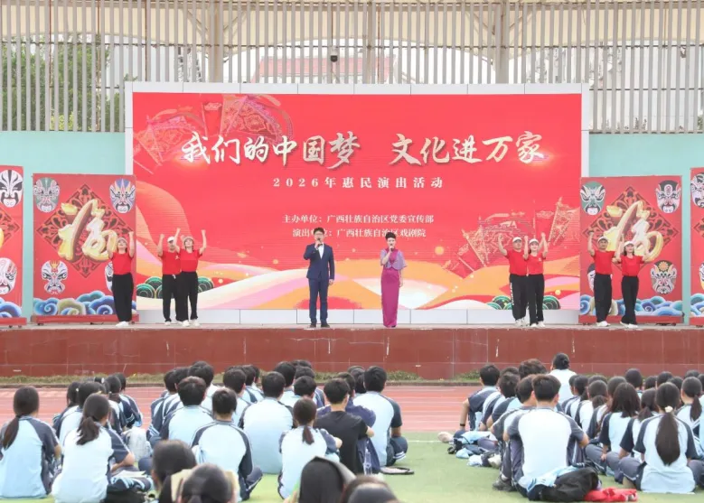 演出在京歌《新时代腾飞新壮乡》的激昂旋律中缓缓启幕,那铿锵的唱腔、优美的舞姿,刹那间点燃了全场师生的热情。
