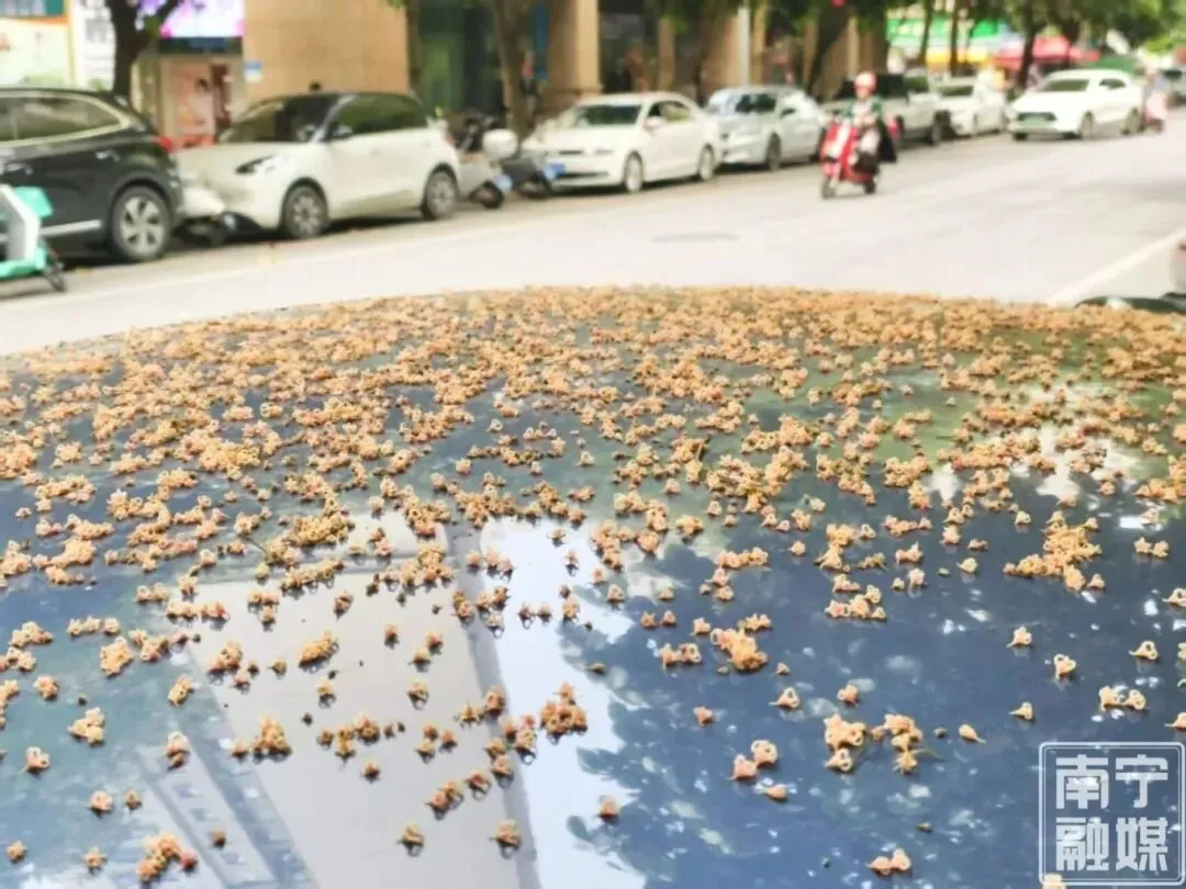 这种会“下雪”的树叫苹婆。在南宁,苹婆树是很有特色的一道风景,每当开花之时,树上便挂满了“小灯笼”,又如镂空雕刻的象牙球,微风拂过,花儿如雪般飘落,如果是恰好在树下停车,不多一会儿,车辆就被这“满天繁星”覆盖,别有一番韵味。