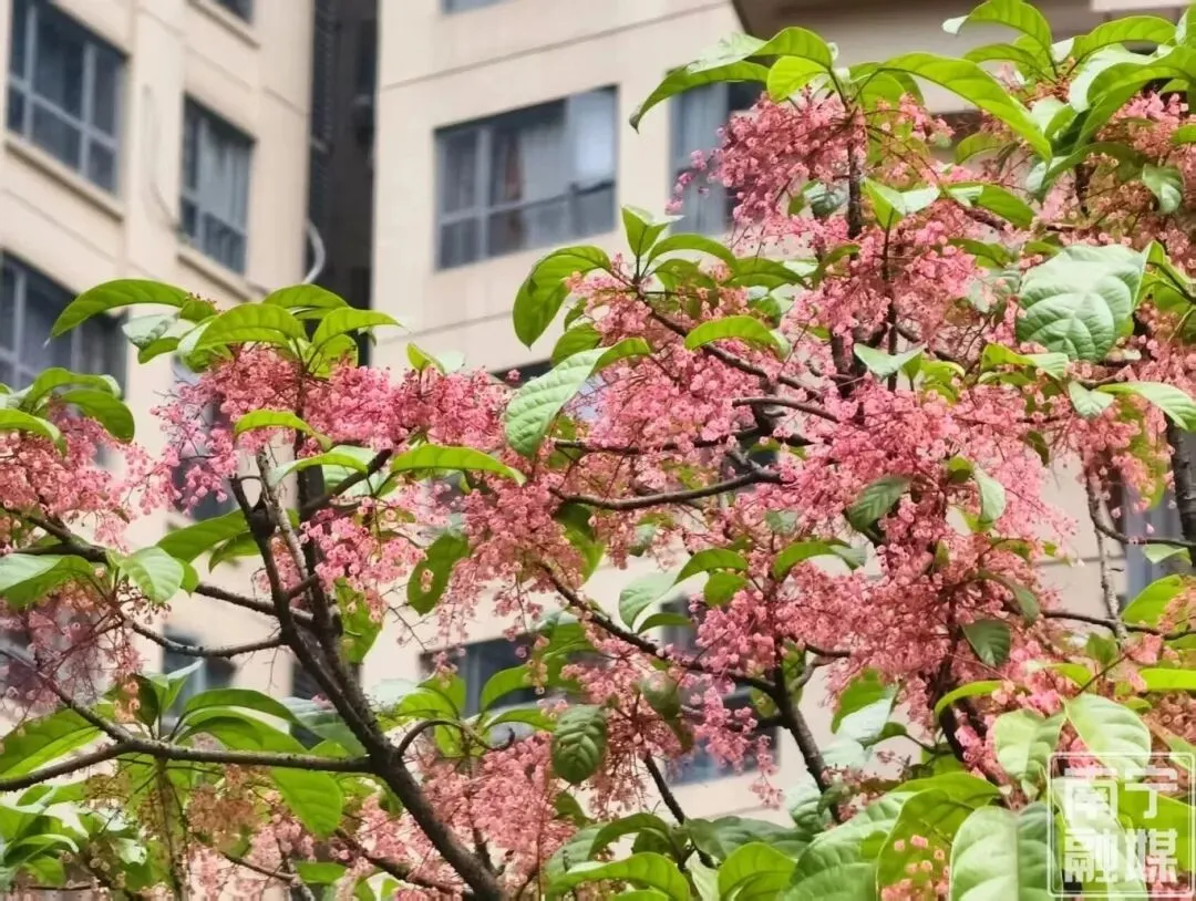 “快看!那棵树好像是在‘下雪’!”近日,路过民族大道国贸中心的市民莫女士突然拽住同伴的衣袖,指着人行道路边的几棵树惊呼道。同伴眯起眼睛,定睛一看,不远处一片奶白色的花雨正簌簌飘落,在三月的温暖阳光中闪着细碎的光。