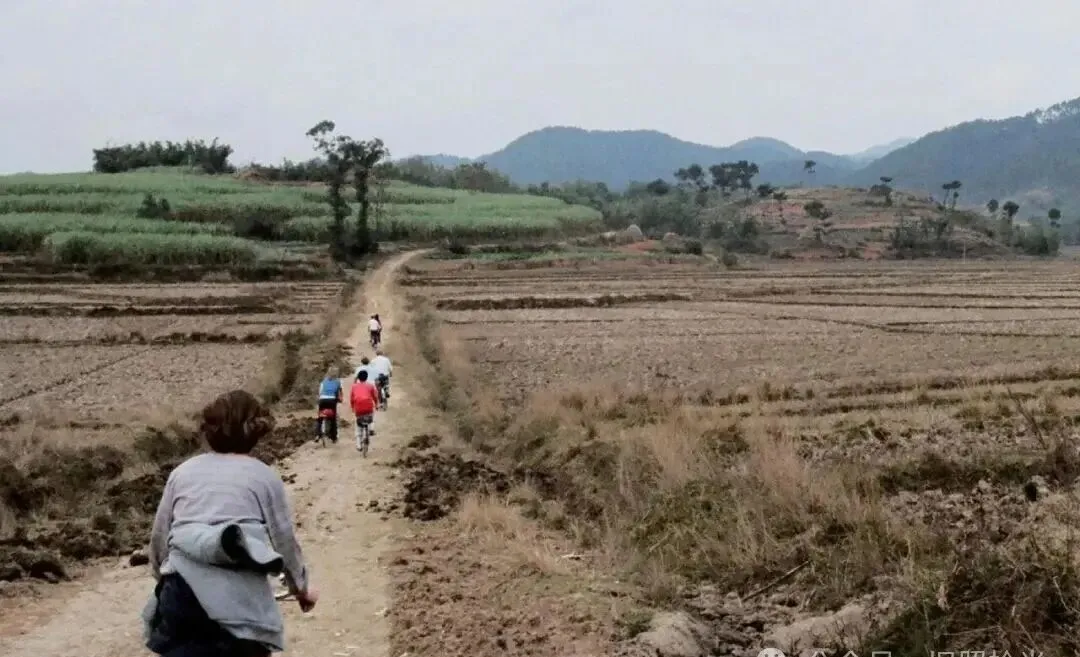 这一幕就更日常了,乡间土路、一溜单人骑着自行车往远处去,路两边是收割过的旱地,还带点杂草和黄土,旁人都是普通打扮,后面那位把外套绑在腰上,学得倒挺地道,现在你让年轻人骑二十公里的乡路试试,怕是没半小时就哼哼,八十年代这样骑着玩,天大地大谁都往外跑。