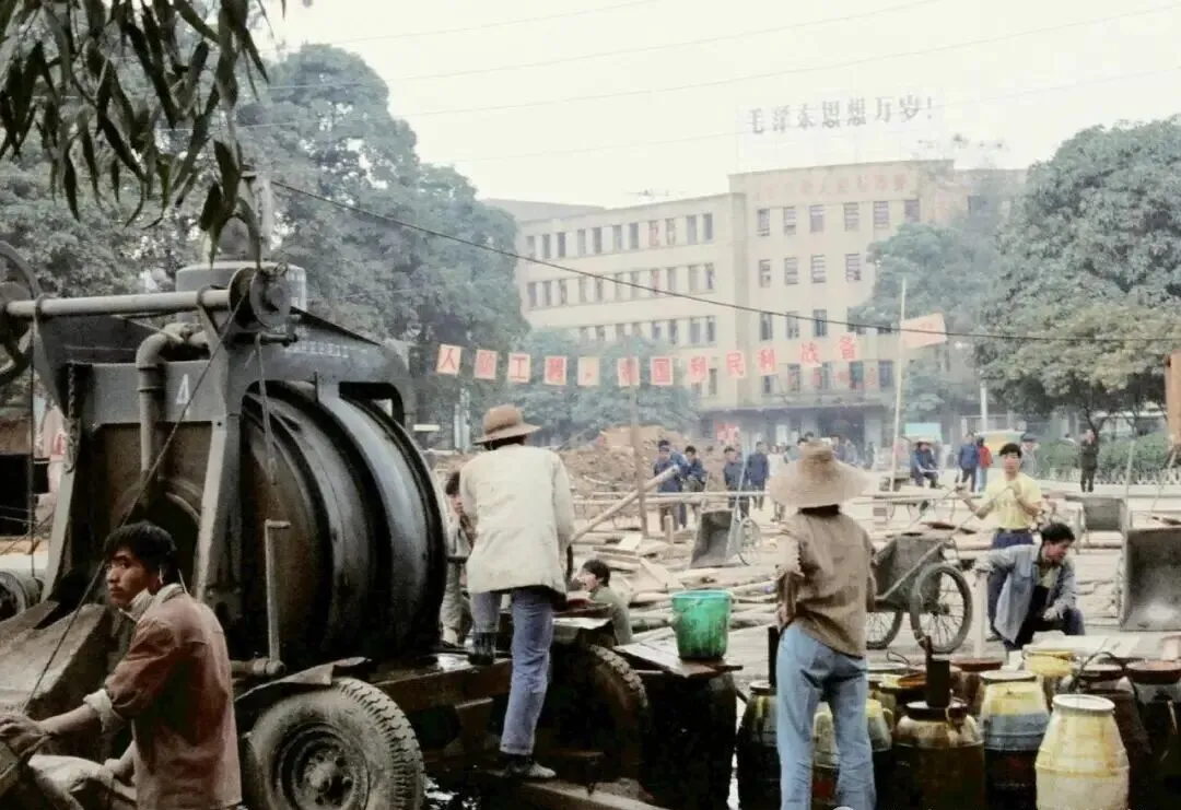 图中这地方是城里修路现场,水泥搅拌机正嗡嗡作响,铁桶泥浆、土堆、工人全是实打实的老场面,工人大多戴草帽,裤腿撸着,围了不少桶和工具,前头一男的正在开搅拌机,后边旗帜写着标语,仔细看街口挂满了红条幅,很阳春很80年代的劲头,现在南宁城区修路都是大型机械和防尘布,那会儿谁还记得灰尘满天,热闹得像赶集。