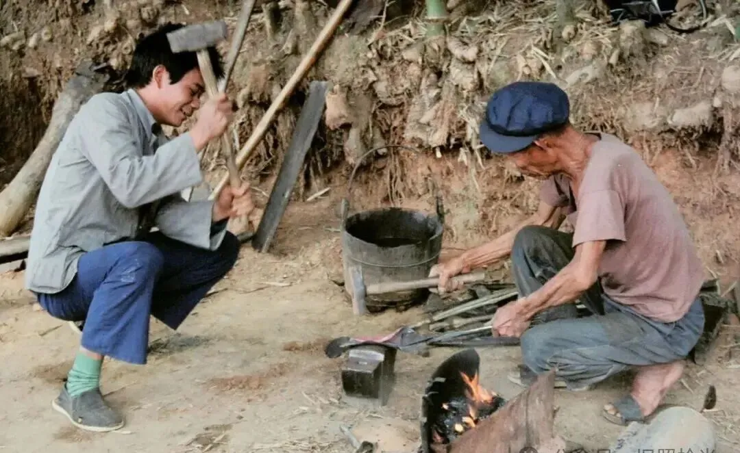 这个画面可真稀罕,图里在乡下土坡底下,有个铁匠铺,炉火咕嘟烧着,左边年轻汉子正举着大锤,一老一少配合敲打铁器,地上横七竖八摆着钉耙锄头,小锅铁片混一起,火光映在脸上,手上都是厚茧,小时候听爷爷说,农具坏了得找铁匠现打现修,一家一年得跑几趟,现在打铁铺早都不见影了,干这行的可以说是全村闻人。