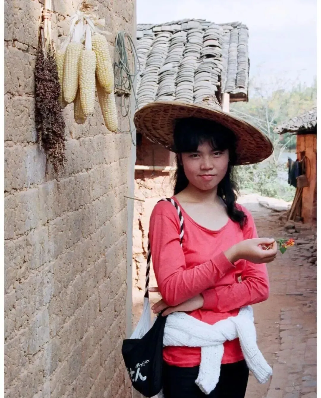 砖墙下又来一位戴斗笠的姑娘,衣服一红一黑,包挎在肩头,墙上还是吊着棒子玉米,一看就是临时摆拍,手里还攥着点小花,目光一挑,像极了那年代城里出来体验生活的样子,这斗笠可不光能挡太阳,乡下收稻谷赶水牛,谁家不备一顶。