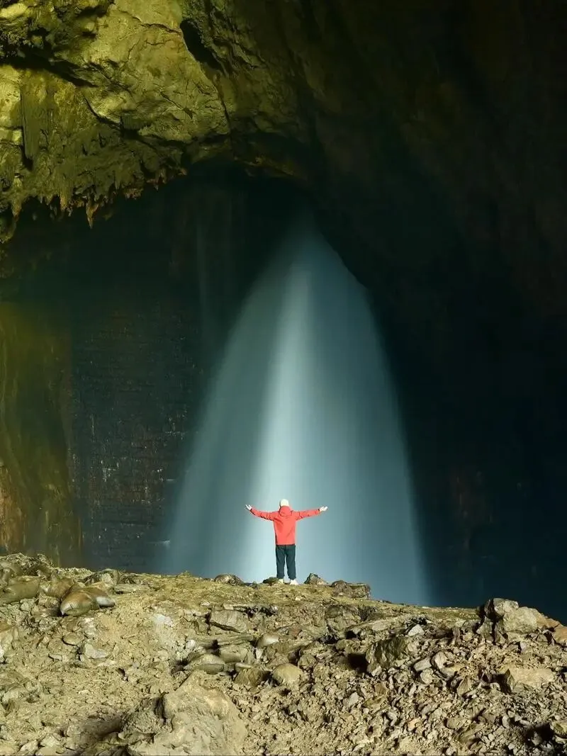 丁达尔光效:正午阳光穿透天坑裂隙,投射出“上帝之眼”般的光束,照亮洞内晶莹水珠,宛如神迹。
