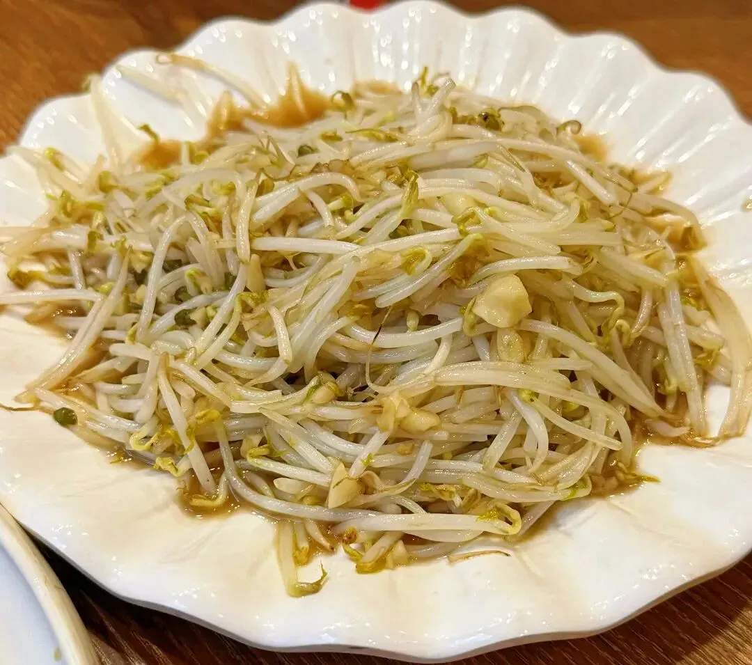 豆芽炒得根根分明,脆生生的,裹着淡淡的蒜香和酱油香,没有多余的调料,却把绿豆芽本身的清甜发挥到了极致。