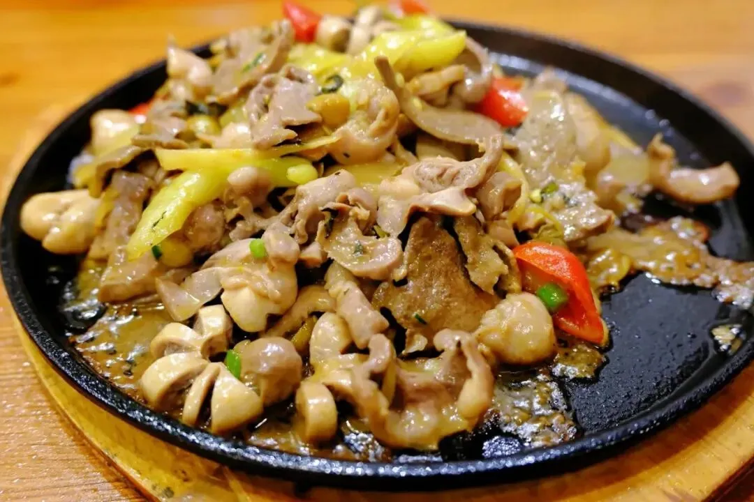 端上来的时候铁板还滋滋作响,猪杂堆得满满当当,有猪心、猪腰、粉肠、猪肚,搭配着酸笋、泡椒、姜丝爆炒,镬气十足。