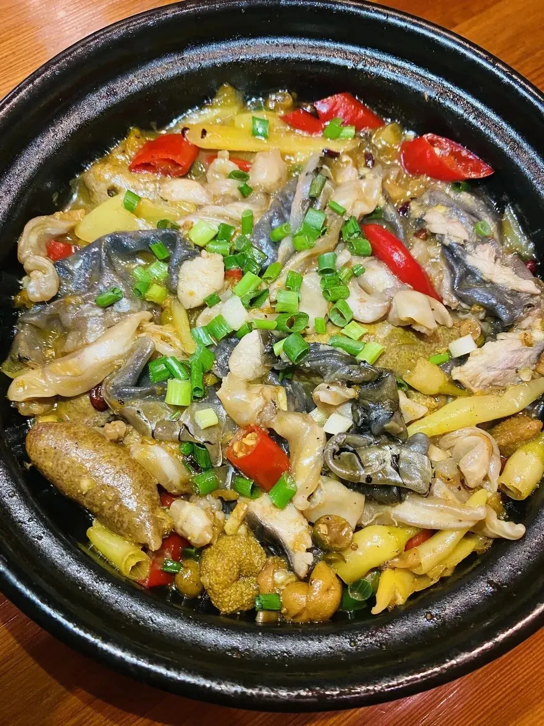 鱼杂处理得很干净,没有一点腥味,搭配着酸笋、泡椒、姜片炖煮,汤汁酸辣浓郁,鱼肉鲜嫩入味,鱼泡软糯弹牙,每一口都吸饱了汤汁,鲜辣过瘾。