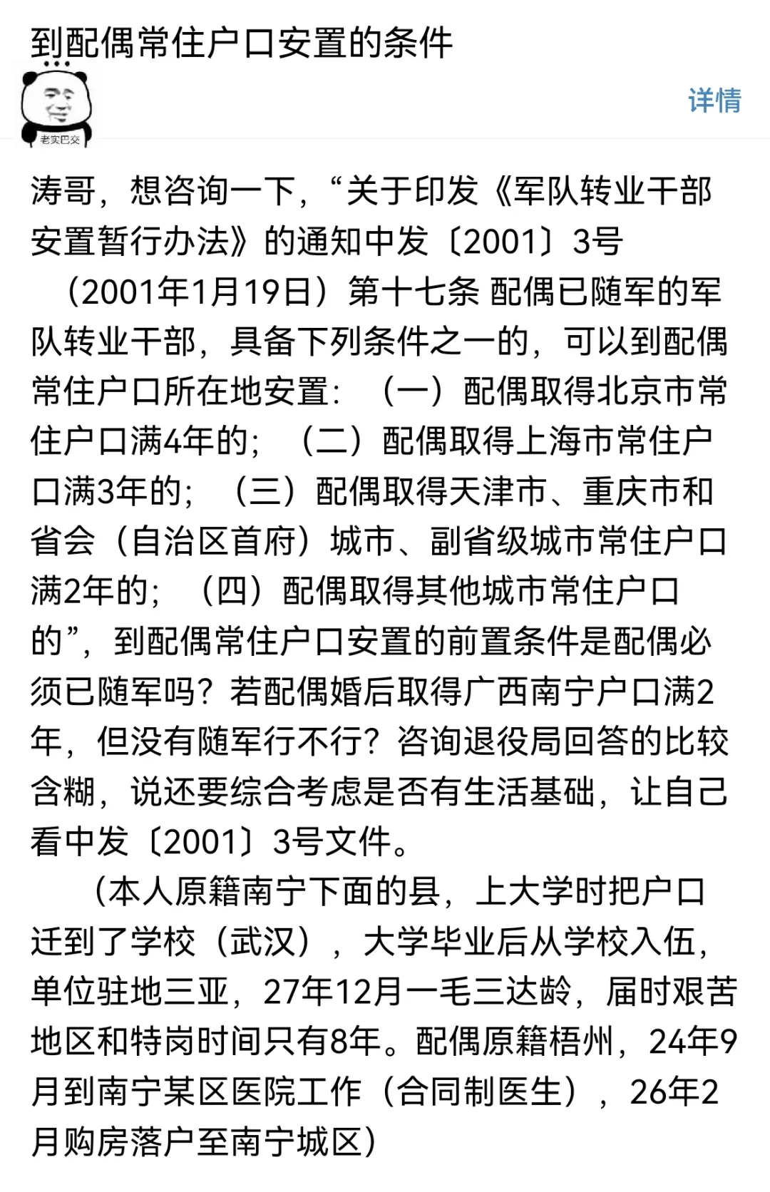 想咨询一下,“关于印发《军队转业干部安置暂行办法》的通知中发〔2001〕3号 (2001年1月19日)第十七条 配偶已随军的军队转业干部,具备下列条件之一的,可以到配偶常住户口所在地安置:(一)配偶取得北京市常住户口满4年的;(二)配偶取得上海市常住户口满3年的;(三)配偶取得天津市、重庆市和省会(自治区首府)城市、副省级城市常住户口满2年的;(四)配偶取得其他城市常住户口的”,到配偶常住户口安置的前置条件是配偶必须已随军吗?若配偶婚后取得广西南宁户口满2年,但没有随军行不行?咨询退役局回答的比较含糊,说还要综合考虑是否有生活基础,让自己看中发〔2001〕3号文件。