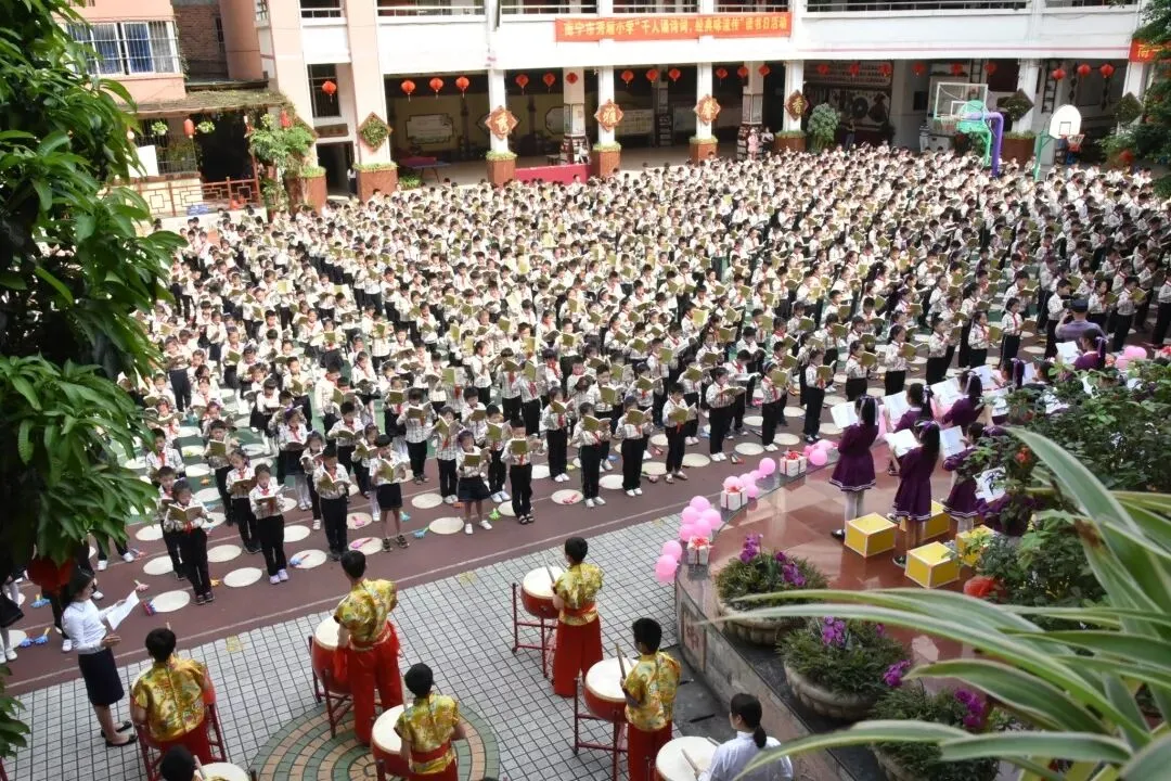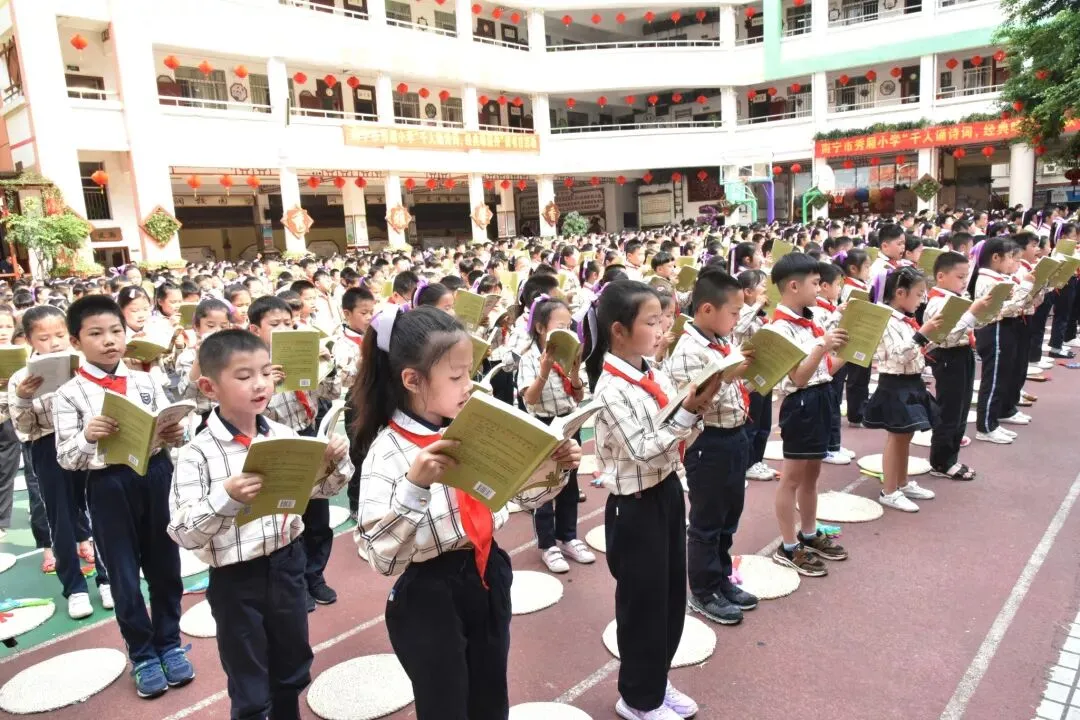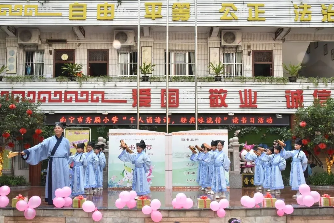 本报南宁讯 4月19日,南宁市秀厢小学举行“千人诵诗词 经典咏流传”诗词经典名篇诵读盛会暨“世界读书日”活动。活动分《欢聚·韶华》《经典·永烁》《四季·芬芳》《励志·向阳》四个篇章进行。