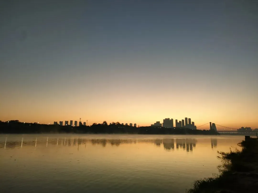 顷刻间,一幅壮丽的画卷便出现了在天空,同时邕江把这一份靓丽倒映在了它的江面上,让朝霞有了一种非常对称的美。令人好是沉醉。