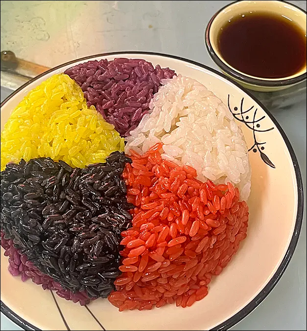 真要说最能记住的,还得是五色糯米饭。颜色不是化出来的,是从山里采来的草木一点点熬出来的:红蓝草、黄饭花、枫叶,汁水浸透糯米,再上木甑蒸。入口不是夸张的刺激,是草木香慢慢往外走,软、糯、弹,越嚼越有山野气。