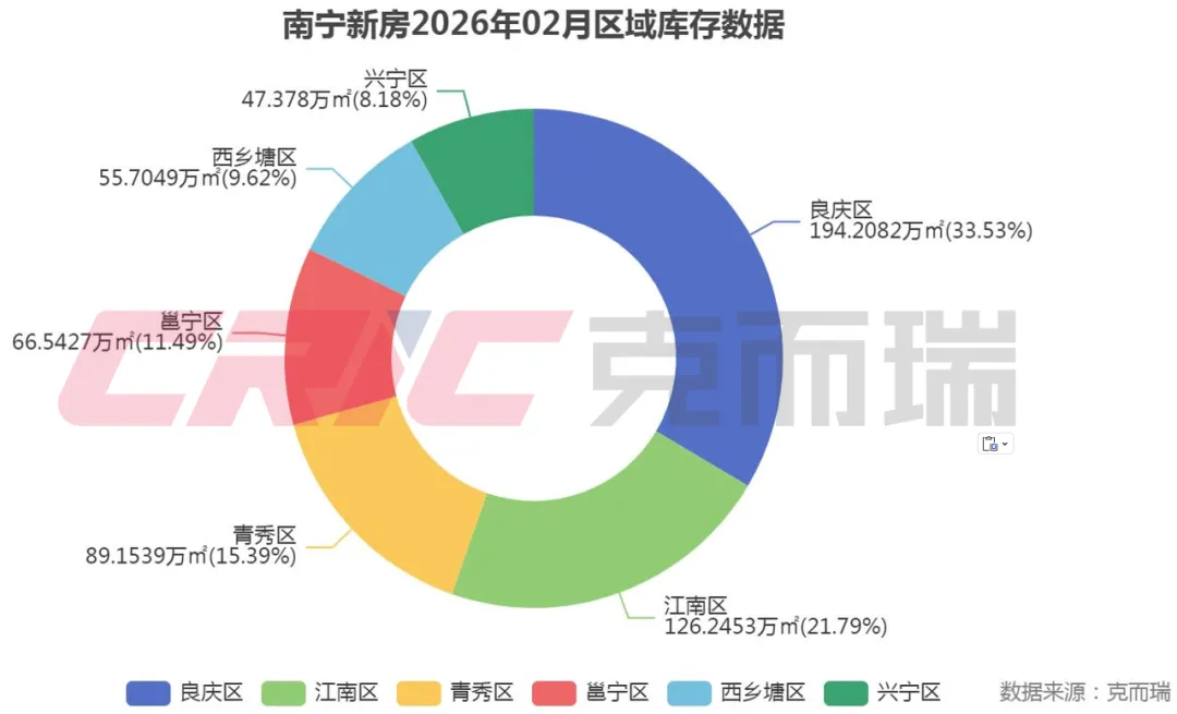克而瑞数据显示,截至2026年2月,南宁全市新房库存面积高达579.23万㎡,库存套数超5.1万套。而在邕宁区,情况更为严峻,去化周期长达83.8个月(约7年)。