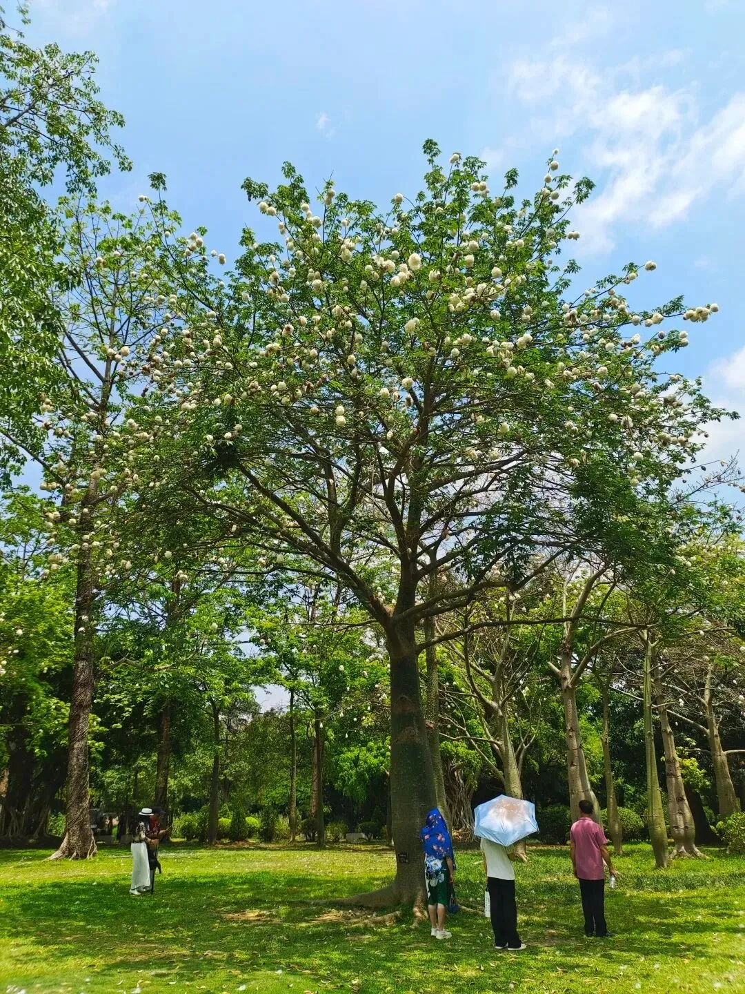 美丽异木棉为了繁衍后代,寻找新的生长地,在每年四五月份果实成熟时,会脱下厚厚的果实外皮,露出一团团白色的絮状物,悬挂在枝头,状如“棉花团”,也有网友戏称为“小绵羊”。