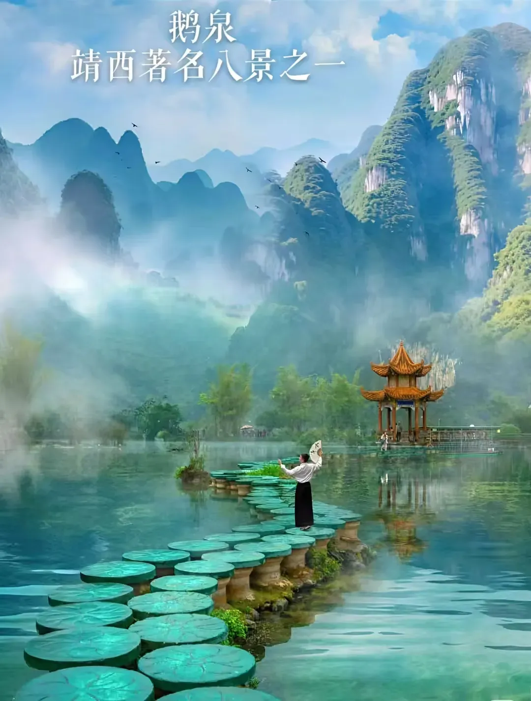 前往游览靖西八景之一【鹅泉】赠送航拍.以上帝视角定格山水美景(游览时间不少于50分钟),鹅泉—灵泉神韵(国家AAAA级景区)靖西著名的八景之一,已有七百多年的历史,中国西南三大名泉之一,鹅泉又名灵泉,现称鹅泉景区,为德天瀑布的源头,位于靖西市城南6公里。鹅泉水四季不涸,水清如镜。周边翠峰如屏,田园似锦,景色如画,明嘉靖皇帝得知此地山川灵秀,赐名“灵泉晚照”。鹅泉自古流传杨媪养神鹅的动人传说,并有鹅泉祭日“鹅泉跃鲤三层浪”之说,我国著名画家关山月先生游览鹅泉时曾挥毫题词:“鹅池跃鲤”。,更使鹅泉披上了神秘的色彩,自古以来留下许多美丽的传说,鹅泉青山环绕、田园如画、翠竹婆娑、水清如镜、鱼虾如梭,在这里可以欣赏到一幅幅画卷式的壮乡田园美景,体会山情野趣的韵味。