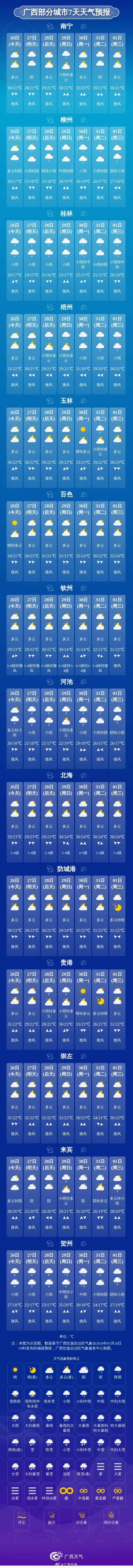 今天白天到晚上,桂林、柳州、河池、贺州等市阴天有小雨、局地大雨,其它地区多云到阴天、局地有小雨。