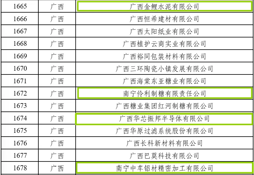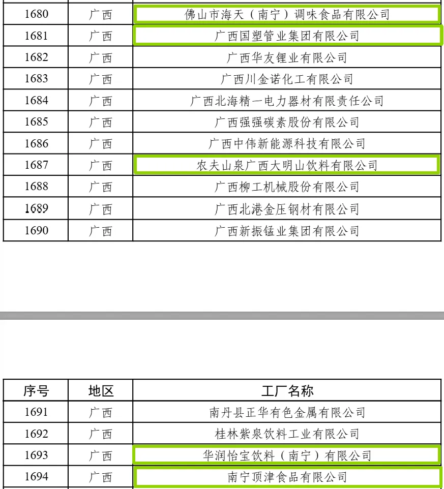 在入选2025年度绿色工厂的名单中,南宁入选企业分别是:广西金鲤水泥有限公司、南宁中车铝材精密加工有限公司、农夫山泉广西大明山饮料有限公司、南宁伶利制糖有限责任公司、佛山市海天(南宁)调味食品有限公司、华润怡宝饮料(南宁)有限公司、南宁顶津食品有限公司、广西华芯振邦半导体有限公司、广西国塑管业集团有限公司。