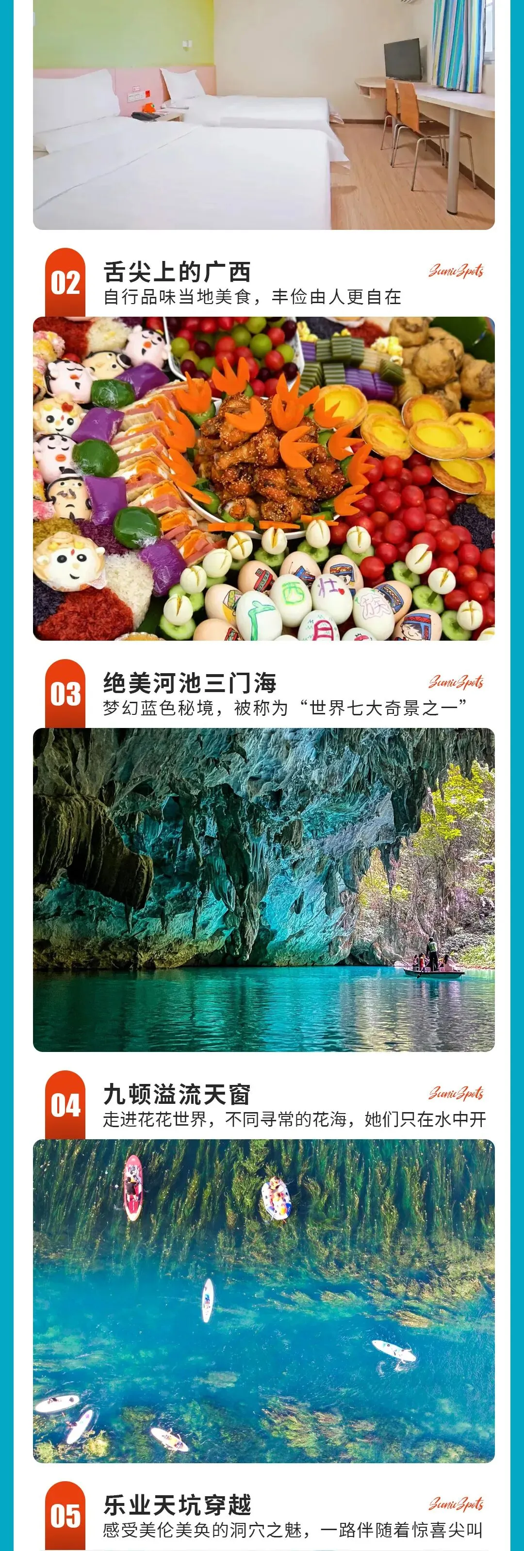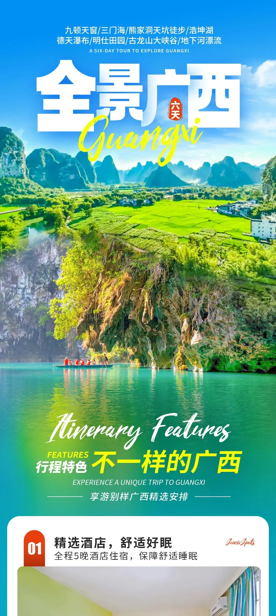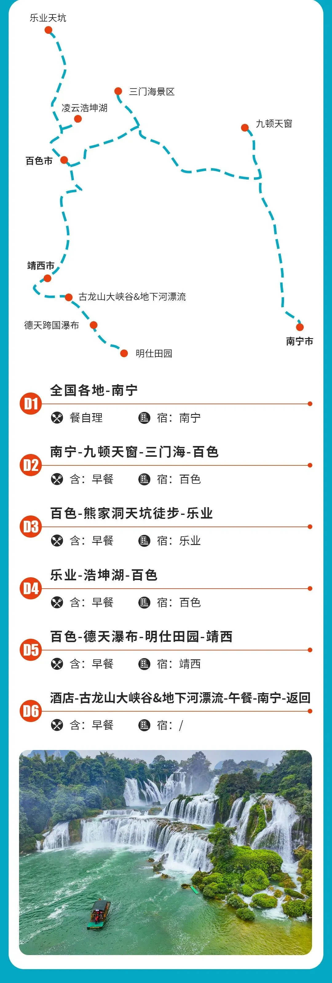 ·活动地点:广西德天瀑布、网红明仕田园、河池三门海、九顿天窗、古龙水大峡谷&地下河漂流、浩坤湖、乐业天坑穿越