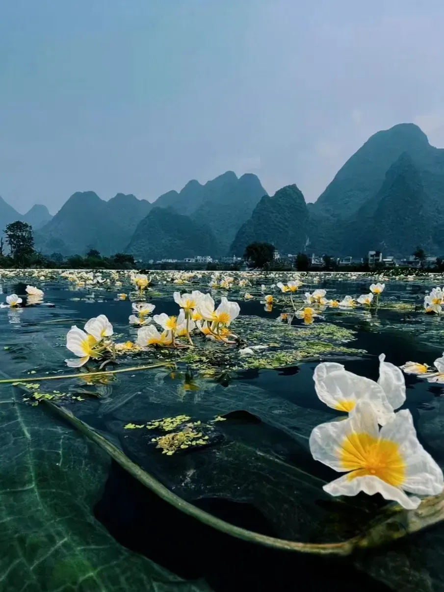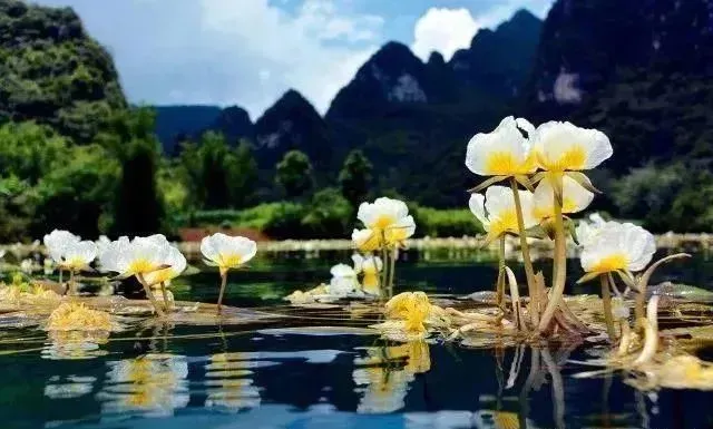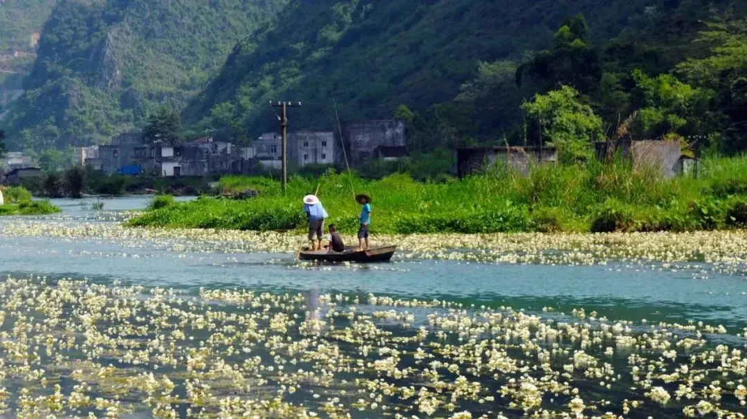 09:30左右抵达后前往都安瑶族自治县,然后前往观赏【澄江会开花的河】(可自费划船体验!海菜花受天气影响,所有开放程度、数量、颜色等均以实物为准,不保证百分百能看到海菜花,敬请谅解)。
