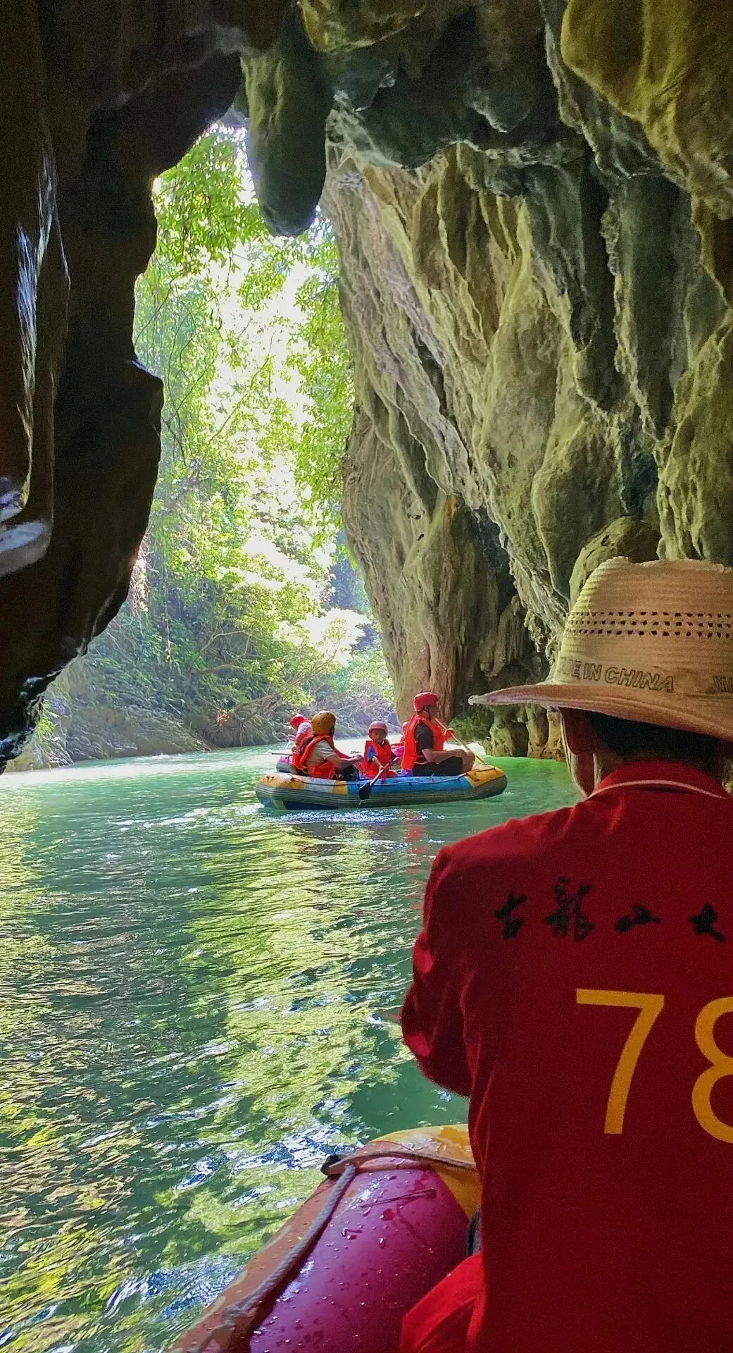 09:00 抵达大峡谷,步行下山,乘坐【皮筏艇船漂流】穿越古劳峡、迎宾洞及地下暗河、新灵峡、百福洞及地下暗河,和孩子们一起在漂流途中欣赏幽深旷野的峡谷风光,享受漂流带来的亲子欢乐。