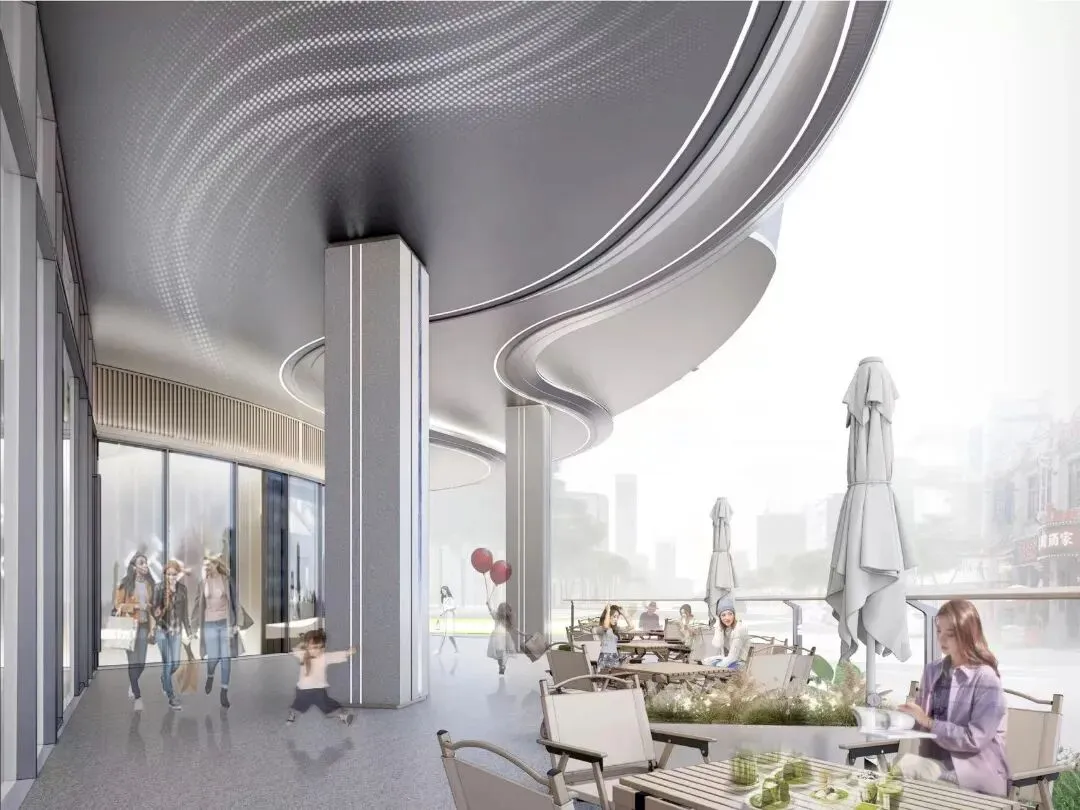 与传统封闭的商业体不同。这里没有封闭的边界,也没有刻意的隔断。空间是打开的,风可以自由地穿行,光可以温柔地洒落,人也可以自在地走进来。通过双首层流畅动线设计,艺术空间与滨江广场实现无缝衔接,自然与城市彼此交融,市民漫步其中,一步一景,一步一息。