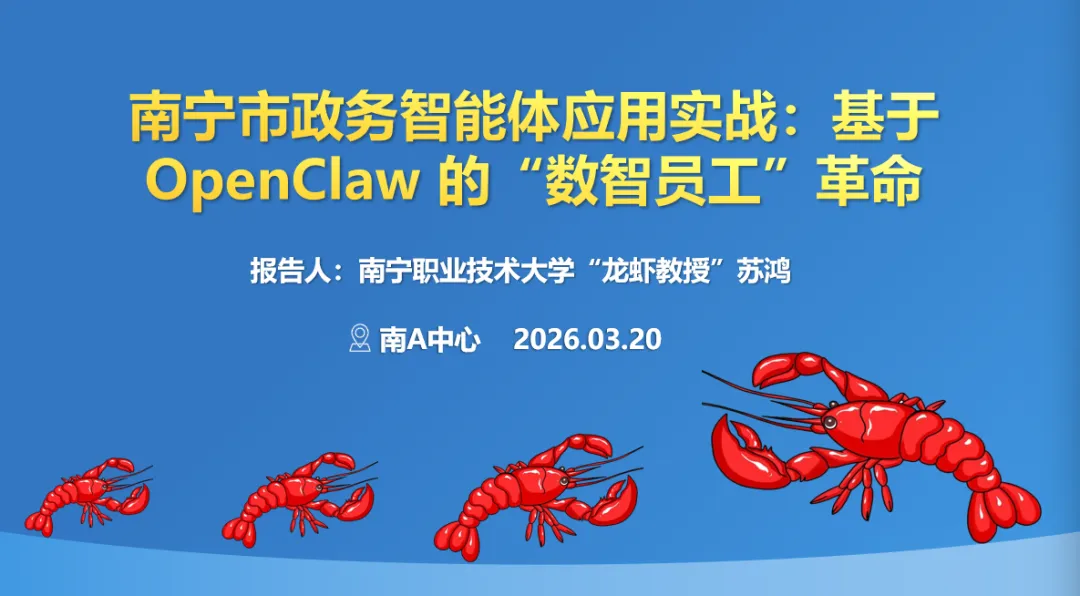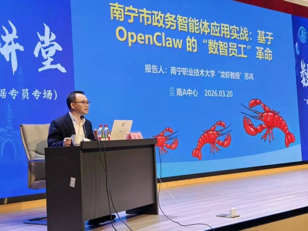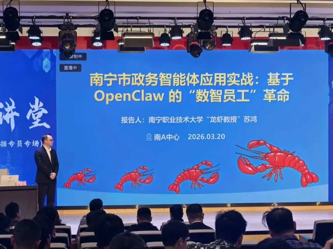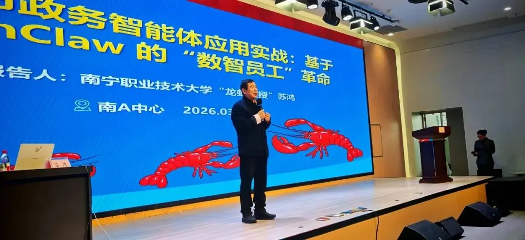2026年3月20日,中国-东盟国家人工智能应用合作中心(南A中心)的多功能厅坐满了人,台上是来自南宁职业技术大学的苏鸿教授在讲授OpenClaw本地化部署和场景应用,台下是上百名参训人员边听边用电脑实操或用手机拍PPT。这是由南A中心工作专班办公室主办、南宁市数据局等单位承办的2026年数据大讲堂“玩转龙虾”系列培训。