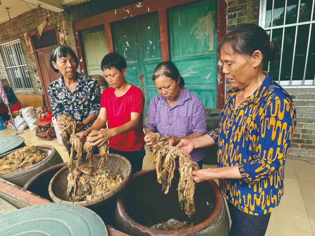 “新农人”向村民讲解扬美古镇梅菜的制作。