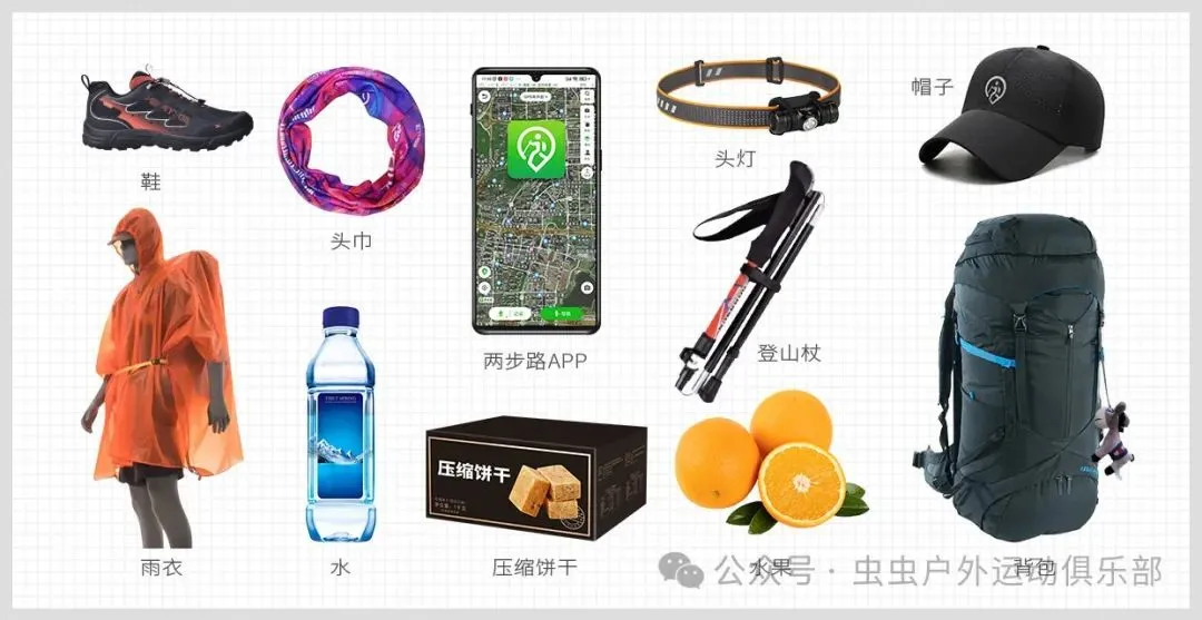 1. 防滑登山鞋+速干衣裤+防风外套;登山杖、防晒帽、墨镜、防晒霜必备