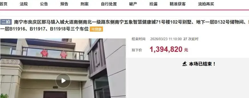 值得注意的是,也是在同一天,这个南宁五象智慧健康城还有另外一栋别墅被拍卖,属于同一起案件而被拍卖的,别墅建筑面积跟上面一栋一样,也是带三个地下停车位,最终也是有4个人报名竞拍,经过22次加价竞拍后,以138.482万元成交,成交价低一万元。