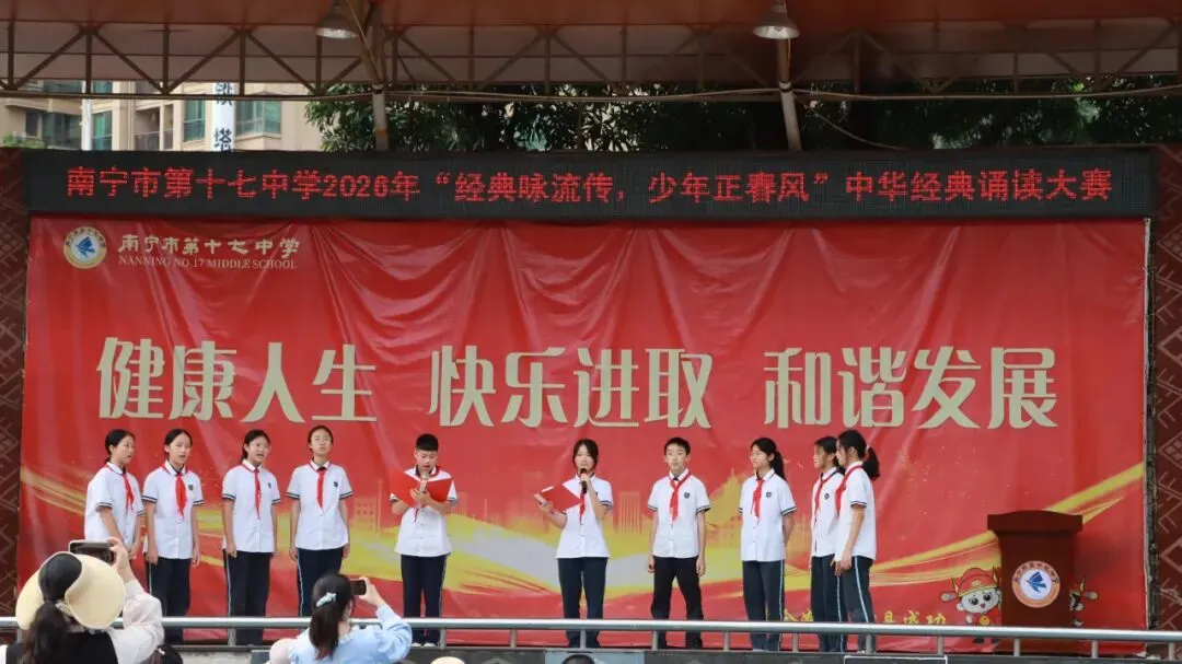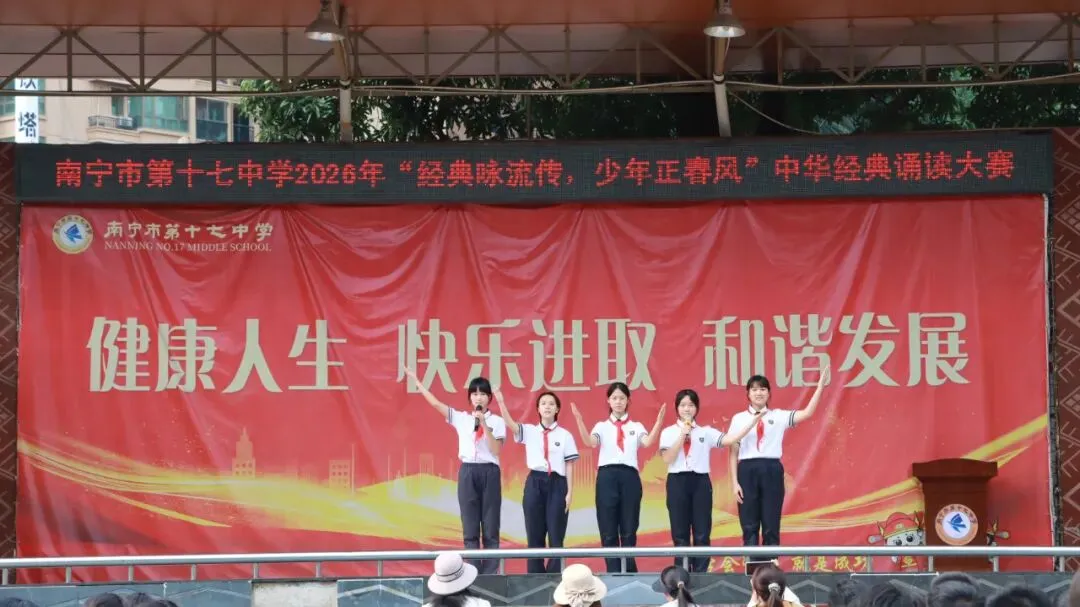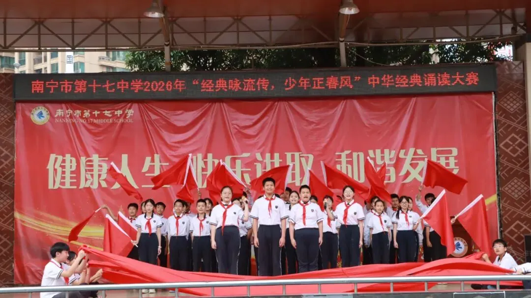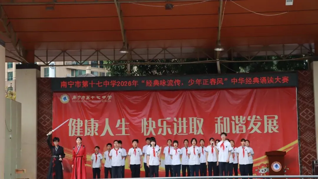 2026年3月,春风拂过怡墨亭,书香漫染十七中。南宁市第十七中学“经典咏流传 少年正春风”中华经典诵读大赛在学校篮球场隆重举行。全校师生齐聚一堂,在经典诗文的字里行间感受中华文化的博大精深,用青春之声为千年文脉注入时代的回响。